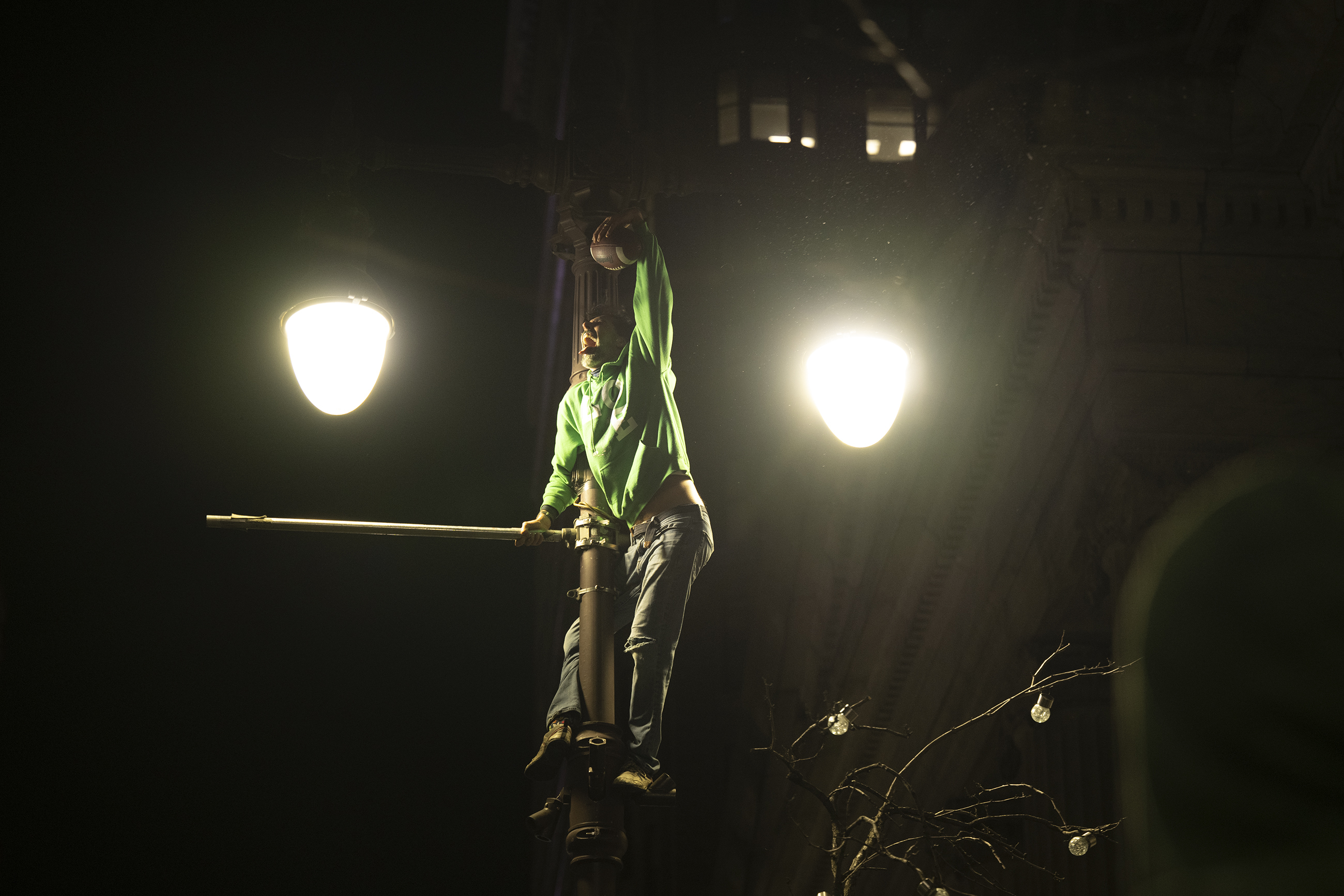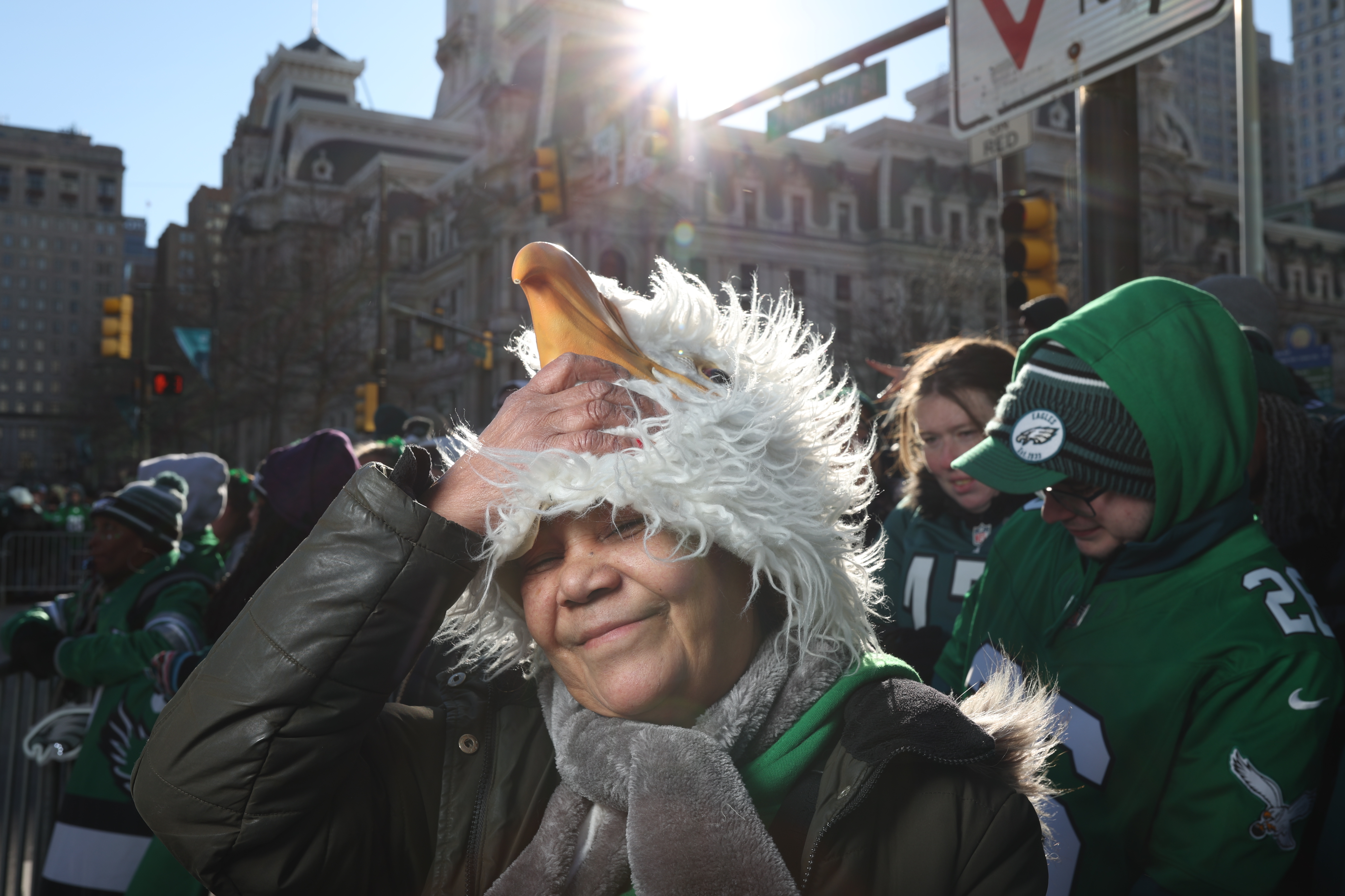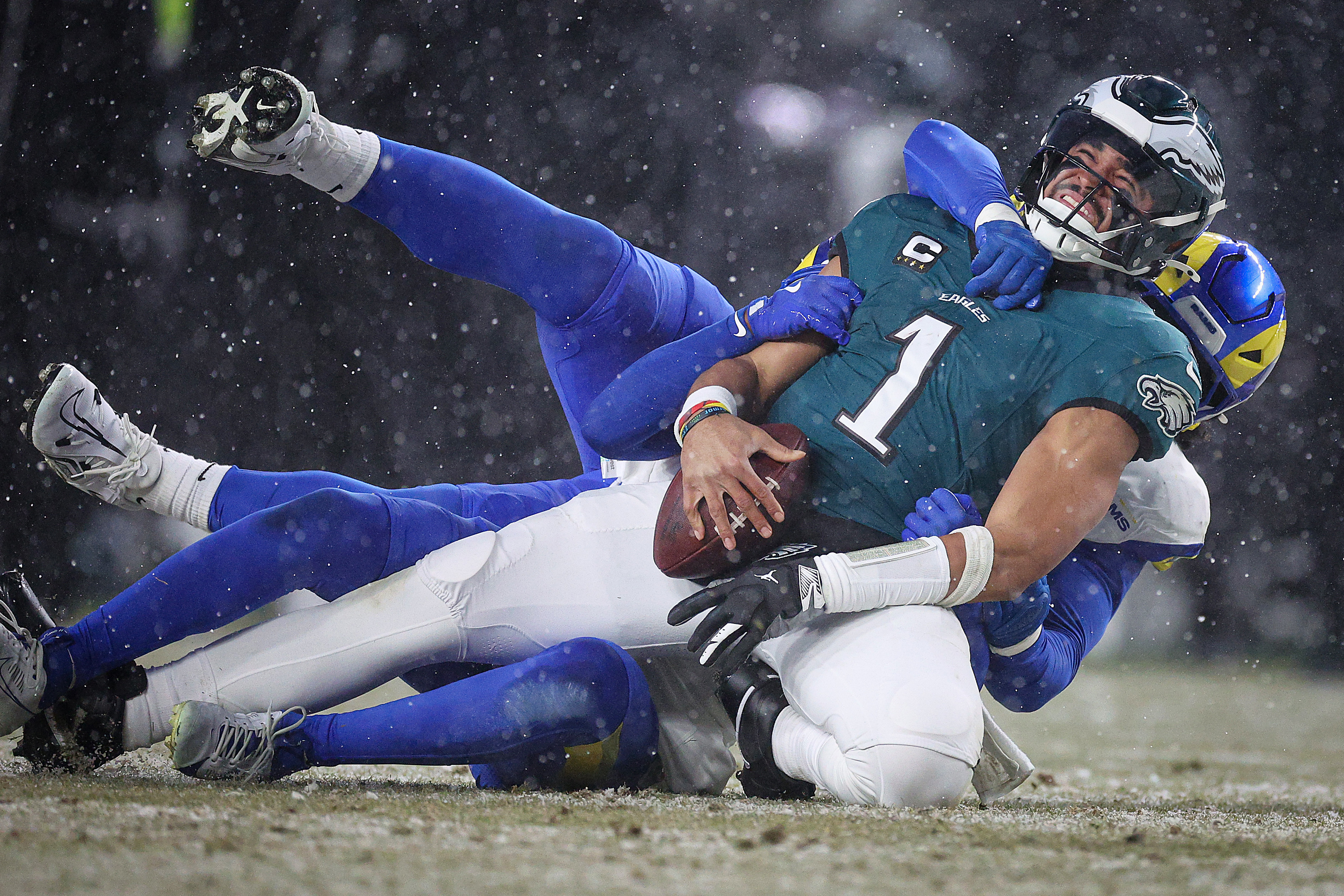 Eagles quarterback Jalen Hurts is sacked by Rams safety Jaylen McCollough during their playoff matchup on Jan. 19. The Eagles won, 28-22.A reveler climbs a pole on Broad Street near City Hall as Eagles fans celebrate the NFC championship rout of the Washington Commanders on Jan. 26.