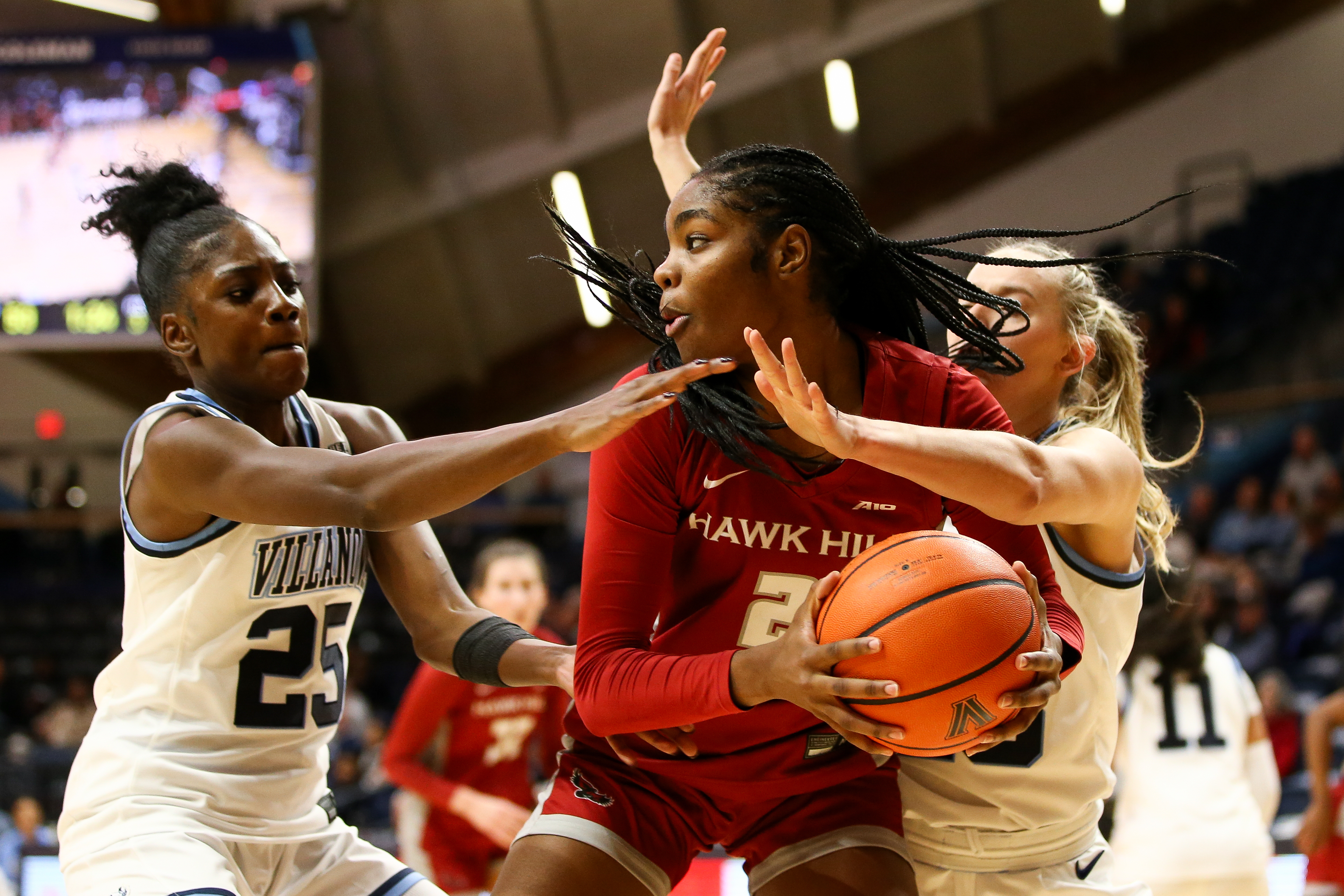 Villanova’s Denae Carter (25) and Kelsey Joens guard St. Joseph’s Aleah Snead during the Big 5 championship at Finneran Pavilion on Sunday. Villanova won, 76-70.