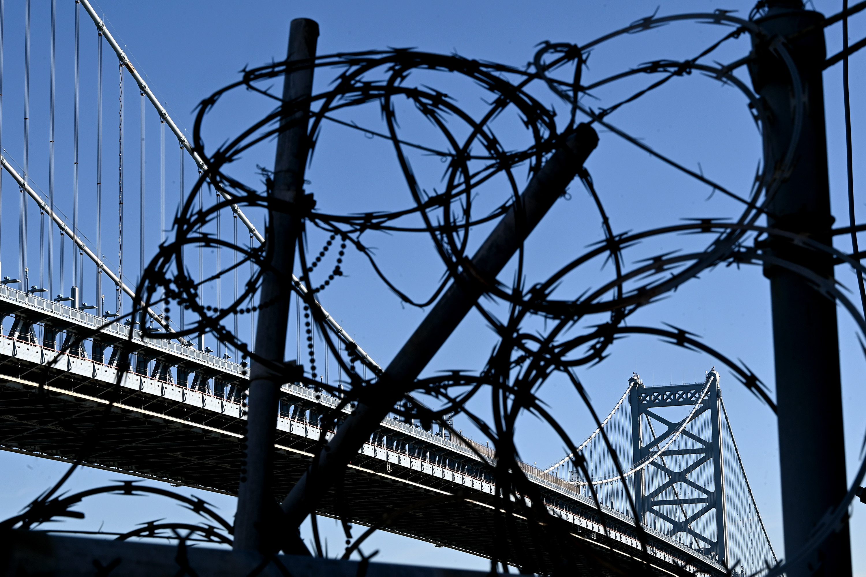Razor wire beside a pier on Columbus Boulevard frames the Benjamin Franklin Bridge Dec. 3, 2025.