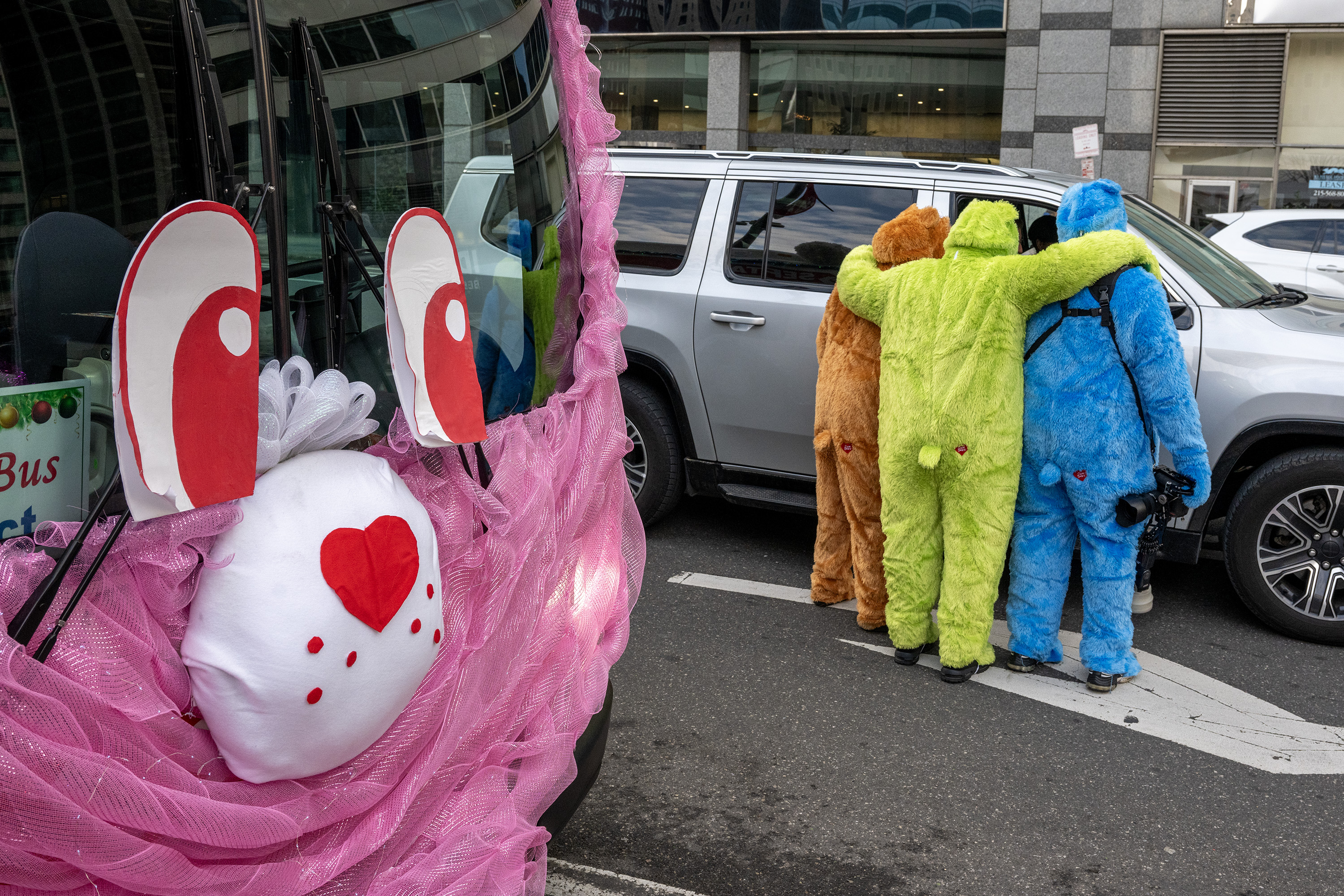 I made a fast photo of SEPTA workers costumed as Care Bears who went over to a passing coworker stopped in traffic. But I couldn’t leave with only a photo of the backsides of mechanic Raymond Borges and operators Jose DeCos and James Smith.