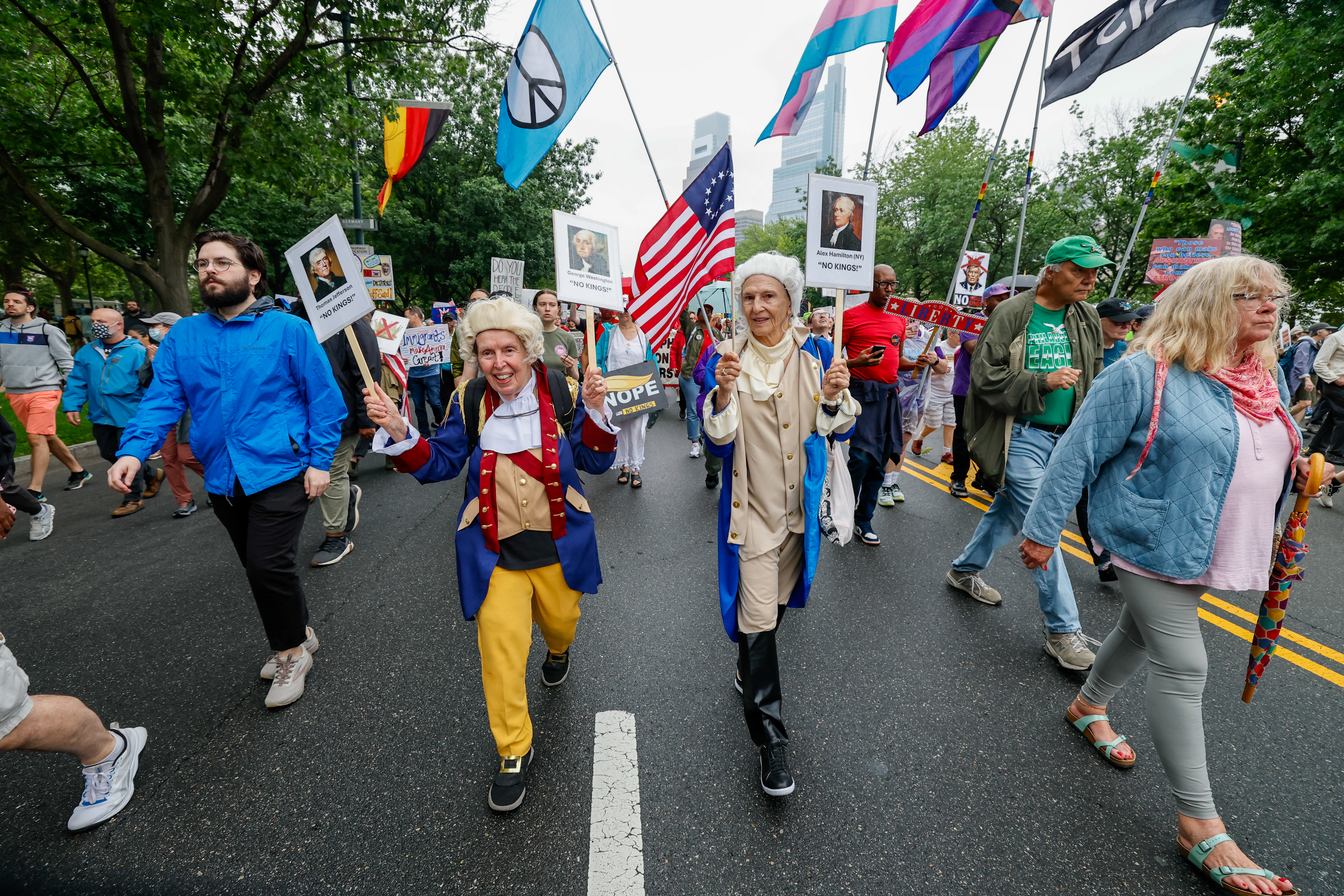 November 29, 2025: t’s ginkgo time in our region again when the distinctive fan-shaped leaves turn yellow and then, on one day, lose all their leaves at the same time laying a carpet on city streets and sidewalks. A squirrel leaps over leaves in the 18th Century Garden in Independence National Historical Park Nov. 25, 2025. The ginkgo (Ginkgo biloba) is considered a living fossil as it’s the only surviving species of a group of trees that existed before dinosaurs. Genetically, it has remained unchanged over the past 200 million years. William Hamilton, owner the Woodlands in SW Phila (no relation to Alexander Hamilton) brought the first ginkgo trees to North America in 1785.November 24, 2025: The old waiting room at 30th Street Station that most people only pass through on their way to the restrooms has been spiffed up with benches – and a Christmas tree. It was placed there this year in front of the 30-foot frieze, “The Spirit of Transportation” while the lobby of Amtrak’s $550 million station restoration is underway. The 1895 relief sculpture by Karl Bitter was originally hung in the Broad Street Station by City Hall, but was moved in 1933. It depicts travel from ancient to modern and even futuristic times. November 17, 2025: Students on a field trip from the Christian Academy in Brookhaven, Delaware County, pose for a group photo in front of the Liberty Bell in Independence National Historical Park on Thursday. The trip was planned weeks earlier, before they knew it would be on the day park buildings were reopening after the government shutdown ended. “We got so lucky,” a teacher said. Then corrected herself. “It’s because we prayed for it.” November 8, 2025: Multitasking during the Festival de Día de Muertos – Day of the Dead – in South Philadelphia.November 1, 2025: Marcy Boroff is at City Hall dressed as a Coke can, along with preschoolers and their caregivers, in support of former Mayor Jim Kenney’s 2017 tax on sweetened beverages. City Council is considering repealing the tax, which funds the city’s pre-K programs. October 25, 2025: Austin Gabauer, paint and production assistant at the Johnson Atelier, in Hamilton Twp, N.J. as the finished “O” letter awaits the return to Philadelphia. The “Y” part of the OY/YO sculpture is inside the painting booth. The well-known sculpture outside the Weitzman National Museum of American Jewish History was removed in May while construction continues on Market Street and has been undergoing refurbishment at the Atelier at the Grounds for Sculpture outside of Trenton.October 20, 2025:The yellow shipping container next to City Hall attracted a line of over 300 people that stretched around a corner of Dilworth Park. Bystanders wondered as they watched devotees reaching the front take their selfies inside a retro Philly diner-esque booth tableau. Followers on social media had been invited to “Climb on to immerse yourself in the worlds of Pleasing Fragrance, Big Lip, and exclusive treasures,” including a spin of the “Freebie Wheel,” for products of the unisex lifestyle brand Pleasing, created by former One Direction singer Harry Styles.October 11, 2025: Can you find the Phillie Phanatic, as he leaves a “Rally for Red October Bus Tour” stop in downtown Westmont, N.J. just before the start of the NLDS? There’s always next year and he’ll be back. The 2026 Spring Training schedule has yet to be announced by Major League Baseball, but Phillies pitchers and catchers generally first report to Clearwater, Florida in mid-February.October 6. 2025: Fluorescent orange safety cone, 28 in, Poly Ethylene. Right: Paint Torch (detail) Claes Oldenburg, 2011, Steel, Fiberglass Reinforced Plastic, Gelcoat and Polyurethane. (Gob of paint, 6 ft. Main sculpture, 51 ft.). Lenfest Plaza at the Pennsylvania Academy of the Fine Arts on North Broad Street, across from the Convention Center.September 29, 2025: A concerned resident who follows Bucks County politics, Kevin Puls records the scene before a campaign rally for State Treasurer Stacy Garrity, the GOP candidate for governor. His T-shirt is “personal clickbait” with a url to direct people to the website for The Travis Manion Foundation created to empower veterans and families of fallen heroes. The image on the shirts is of Greg Stocker, one of the hosts of Kayal and Company, “A fun and entertaining conservative spin on Politics, News, and Sports,” mornings on Talk Radio 1210 WPHT.September 22, 2025: A shadow is cast by “The Cock’s Comb,” created by Alexander “Sandy” Calder in 1960, is the first work seen by visitors arriving at Calder Gardens, the new sanctuary on the Ben Franklin Parkway. The indoor and outdoor spaces feature the mobiles, stabiles, and paintings of Calder, who was born in Philadelphia in 1898, the third generation of the family’s artistic legacy in the city.September 15, 2025: Department of Streets Director of Operations Thomas Buck leaves City Hall following a news conference marking the activation of Automated Speed Enforcement (ASE) cameras on the Broad Street corridor – one the city’s busiest and most dangerous roads. The speed limit on the street, also named PA Route 611, is 25 mph.September 8, 2025: Middle schoolers carry a boat to the water during their first outing in a learn-to-row program with the Cooper Junior Rowing Club, at the Camden County Boathouse on the Cooper River in Pennsauken. September 1, 2025: Trumpet player Rome Leone busks at City Hall’s Easr Portal. The Philadelphia native plays many instruments, including violin and piano, which he started playing when he was 3 years old. He tells those who stop to talk that his grandfather played with Billie Holiday, Duke Ellington, Nina Simone, and Dizzy Gillespie. August 25, 2025: Bicycling along on East Market Street.