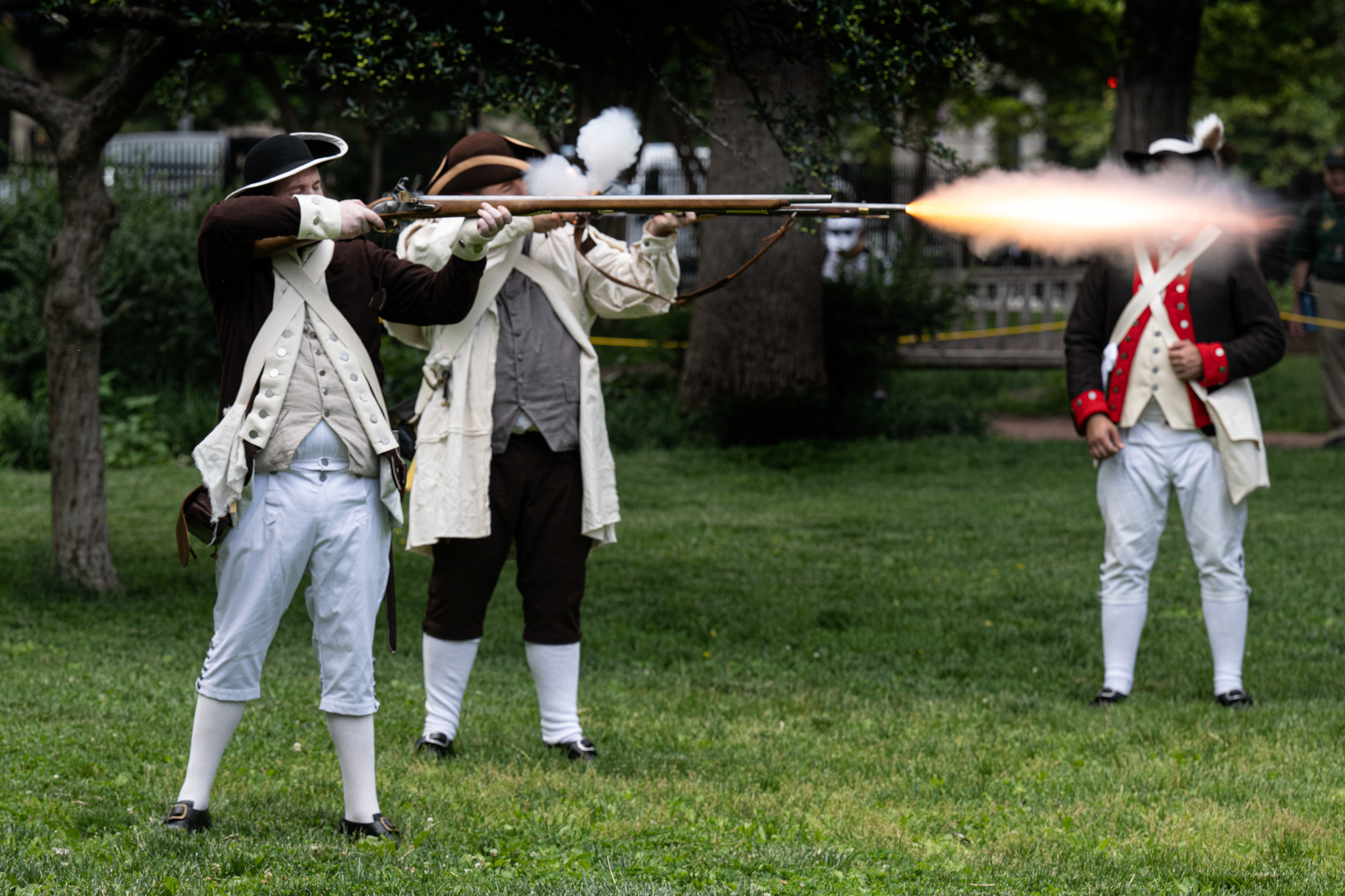 Historical interpreters Benjamin Franklin (from left) Gen. George Washington and President Abraham Lincoln are in the audience as the U.S. Mint unveils new coins for America’s 250th birthday.