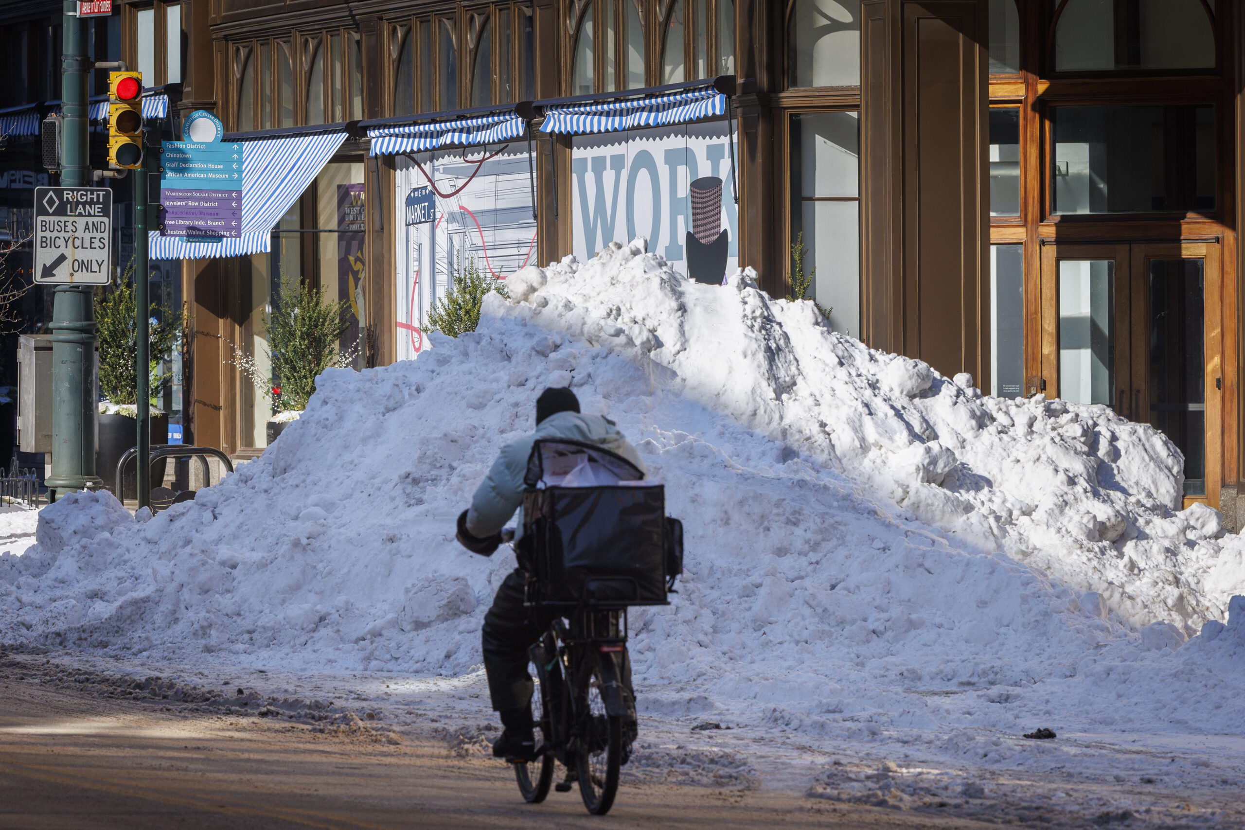 Mount Market Street at 7th Street, Center City Philadelphia, Tuesday, Jan. 27, 2026. Large pile of snow on northeast corner of Market and 7th.