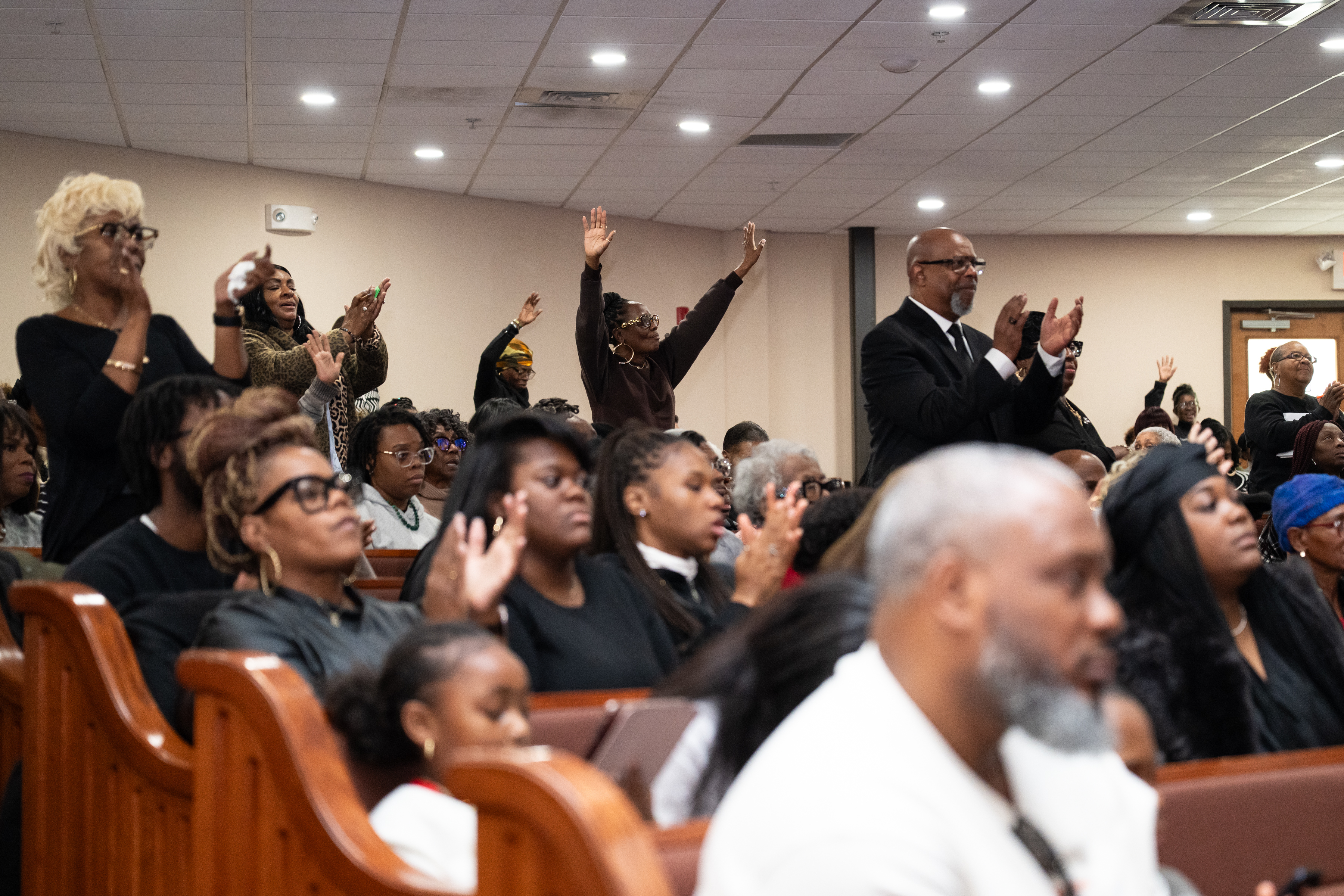 Congregants at the Church of Christian Compassion cheer as Mayor Cherelle L. Parker addresses the crowd before service in the Cobbs Creek neighborhood of West Philadelphia on Sunday, Dec. 7, 2025.