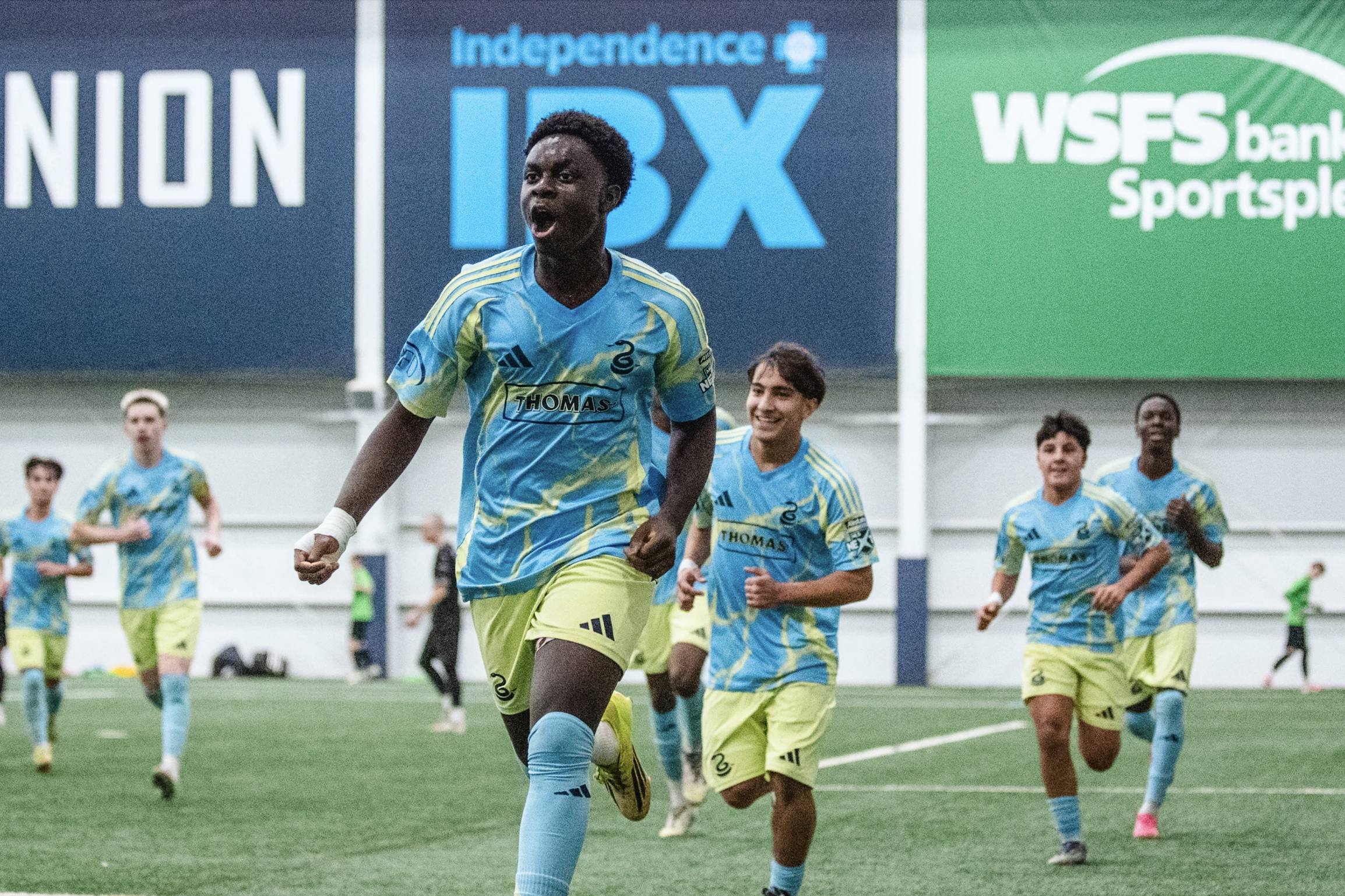 Indiana Vassilev (center) celebrates scoring a goal for the Union in August.