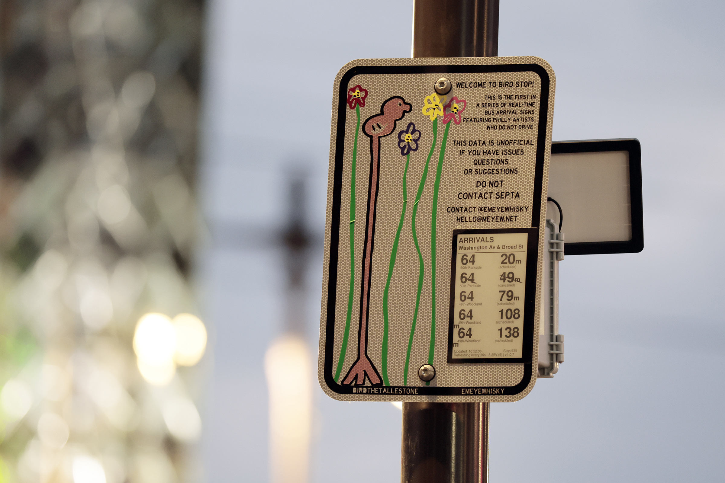 Their creation is inconspicuous; to passersby, it could be a road sign graffitied with a lanky bird and stalky flowers. Commuters might get closer and see it reads, “This data is unofficial. … Do not contact SEPTA.”