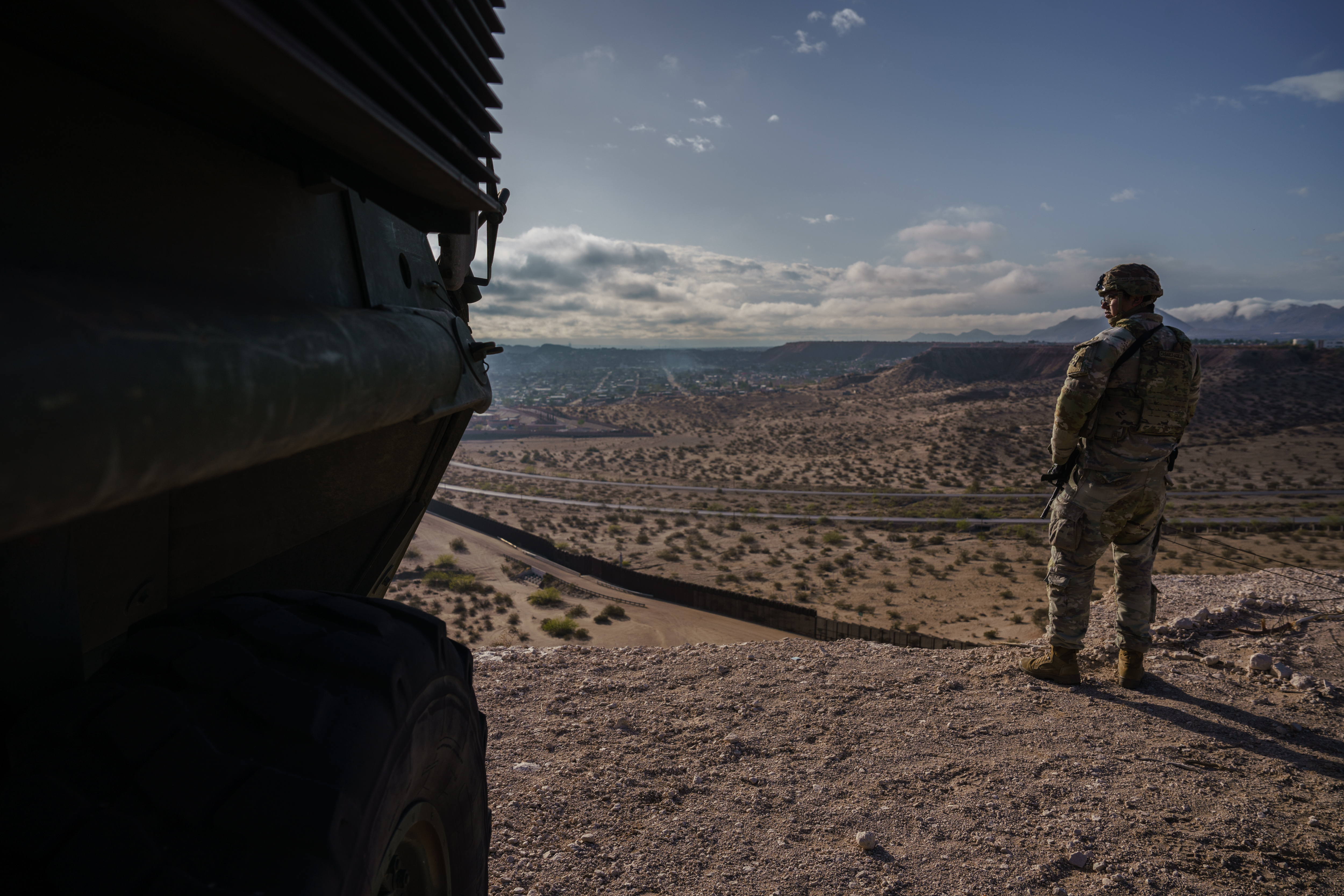 A U.S. soldier is deployed along the U.S.-Mexico border as part of the Joint Task Force Southern Border mission, in Sunland Park, N.M., on April 4.