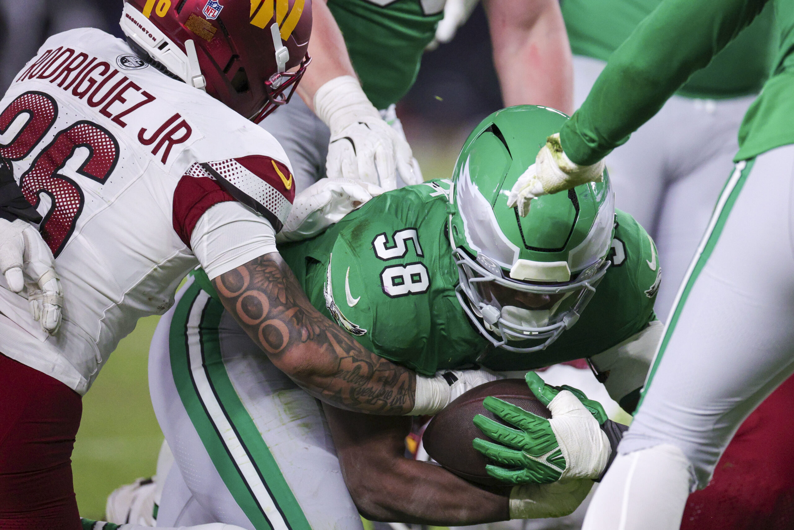 Smith caught two more passes on the ensuing possession, an 8-yarder and a leaping 27-yard grab over Commanders cornerback Jonathan Jones. His three catches for 52 yards brought him to 1,008 on the season, prompting Sirianni to pull him from the game.