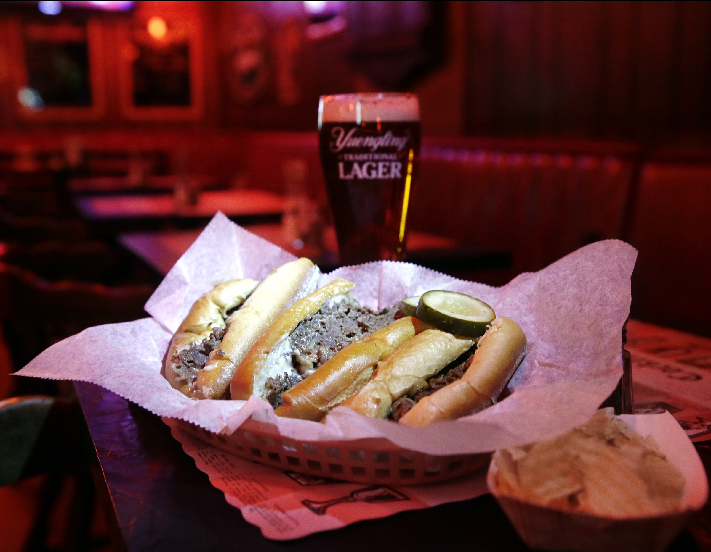 Oscar’s cheesesteak-and-a-half and a tall Yuengling at Oscar’s Tavern on Sansom St. on March 22, 2018.