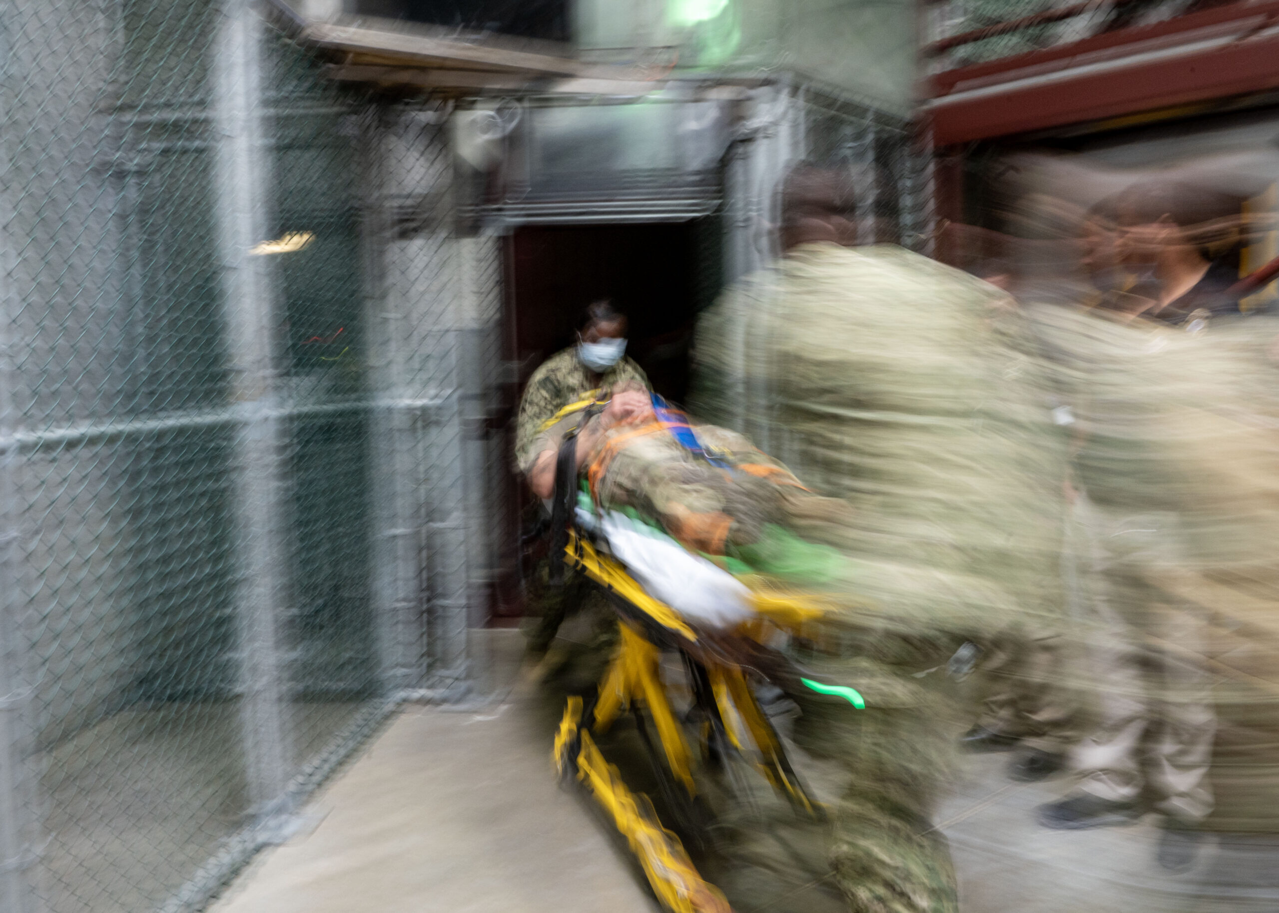 Medics practice evacuating a detained immigrant in a simulated exercise at Guantánamo in April 2025.