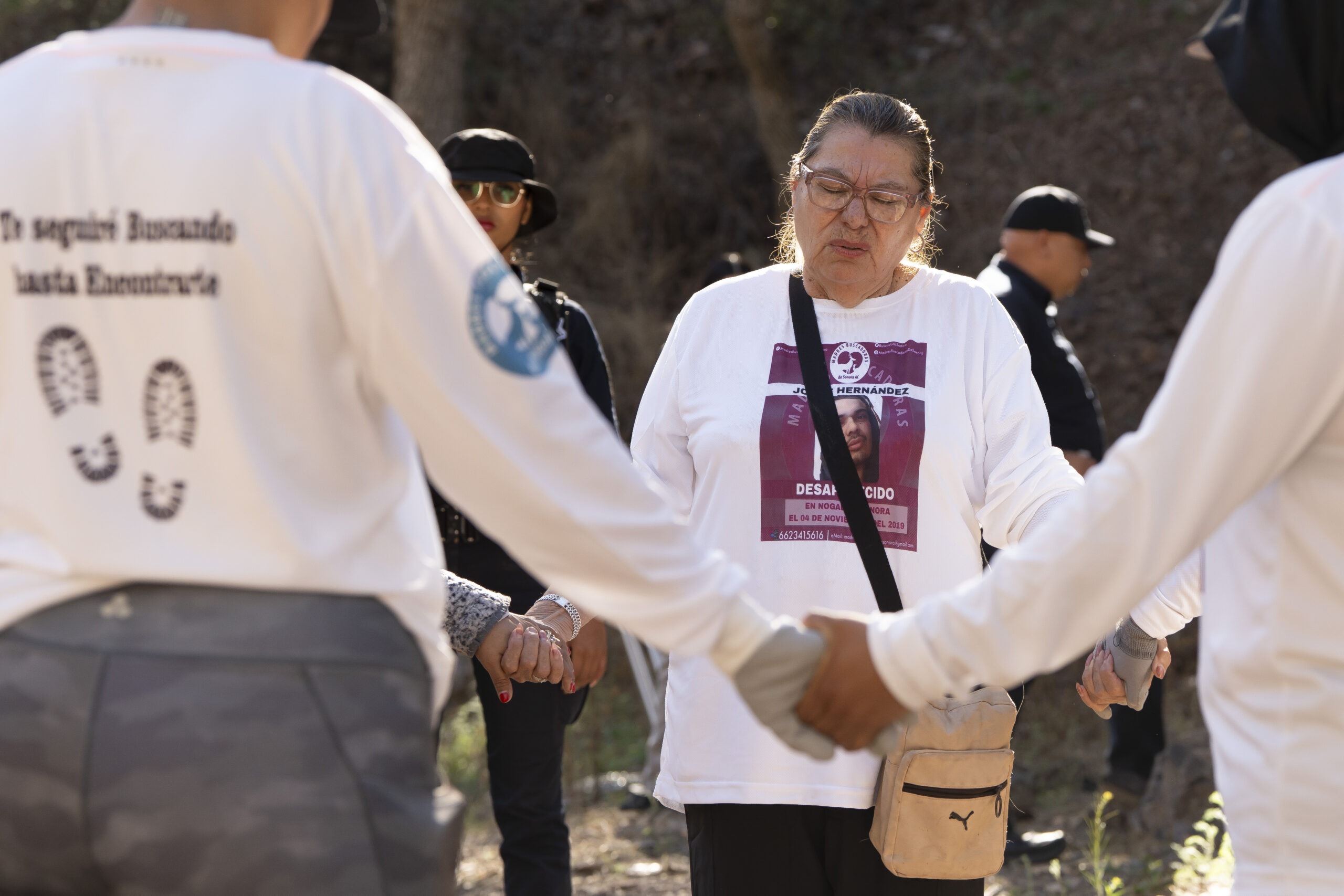 For Hernandez, the grim work has been a boon, a constructive activity she has embraced in the pain and uncertainty she has lived with since her son, Jorge, 28, disappeared in Nogales on Nov. 4, 2019. Like the other mothers, she wears a white T-shirt with a purple logo and photo of her son above the word “DISAPPEARED.”