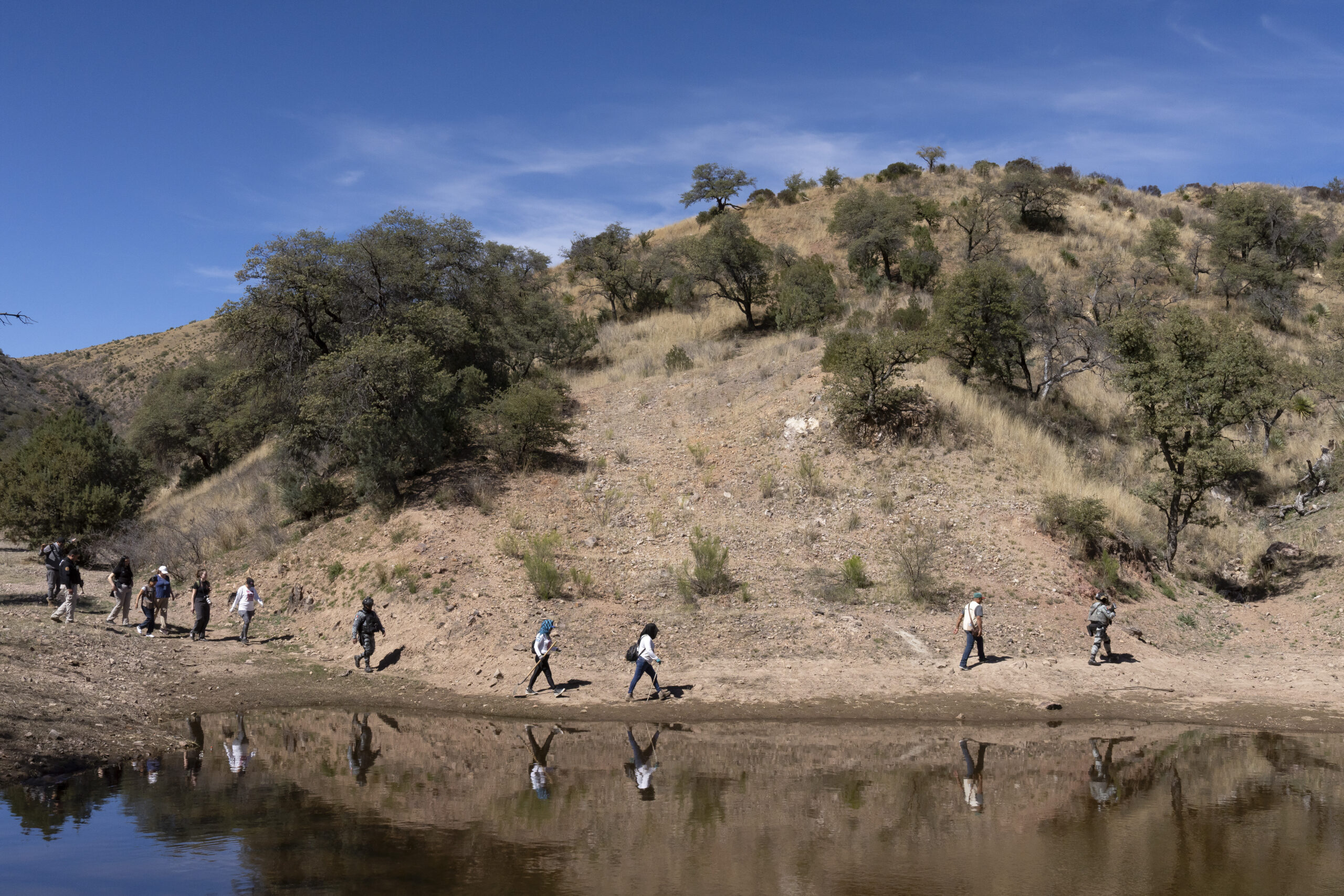 On Wednesday, Hernandez and the Searching Mothers traveled on a dirt road, deep with ruts about an hour south of Guthrie’s home, to a remote area with cacti and mesquite trees near the U.S.-Mexico border. The border wall, a rust-colored ribbon, unspooled in the northern distance over the dun-colored landscape.