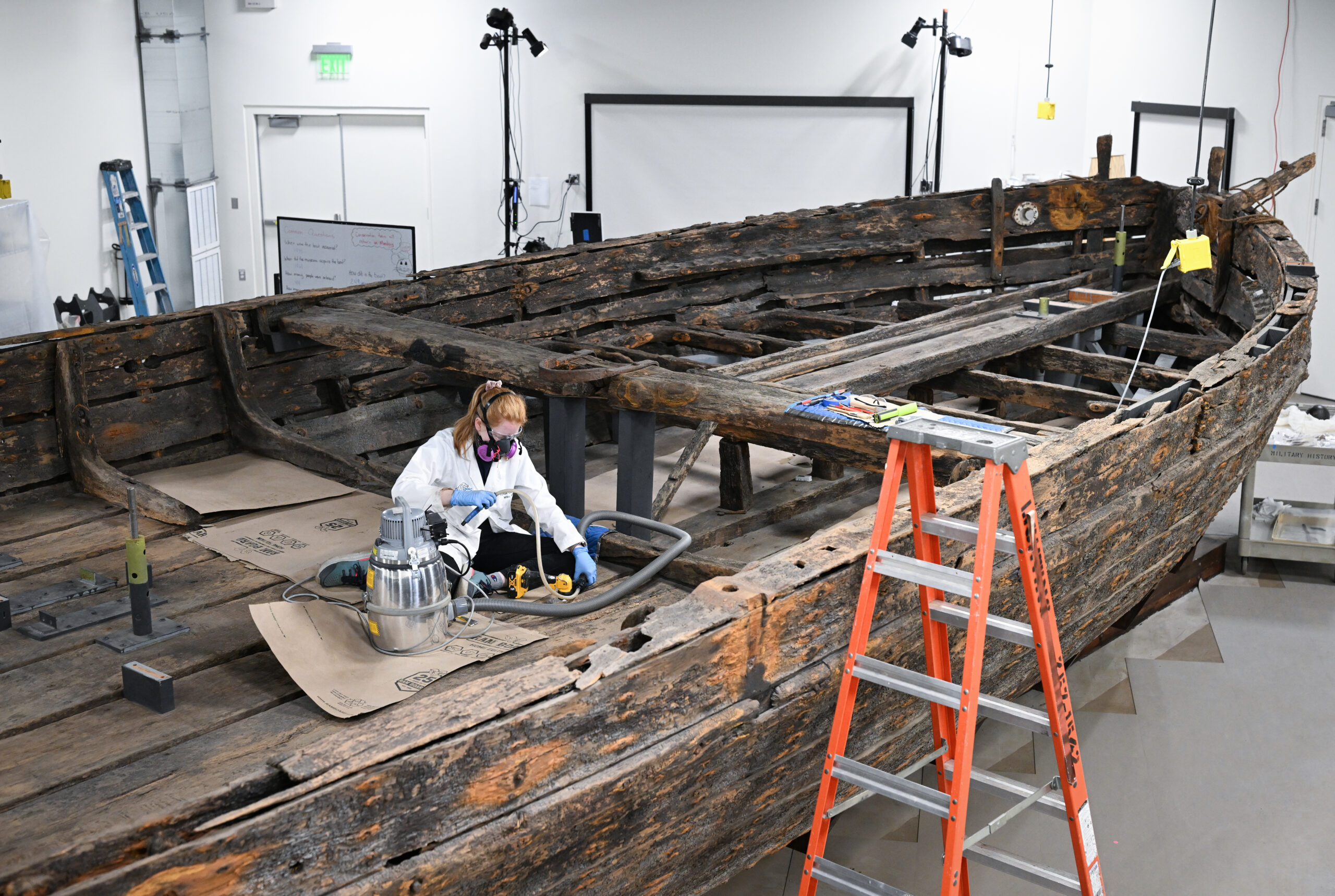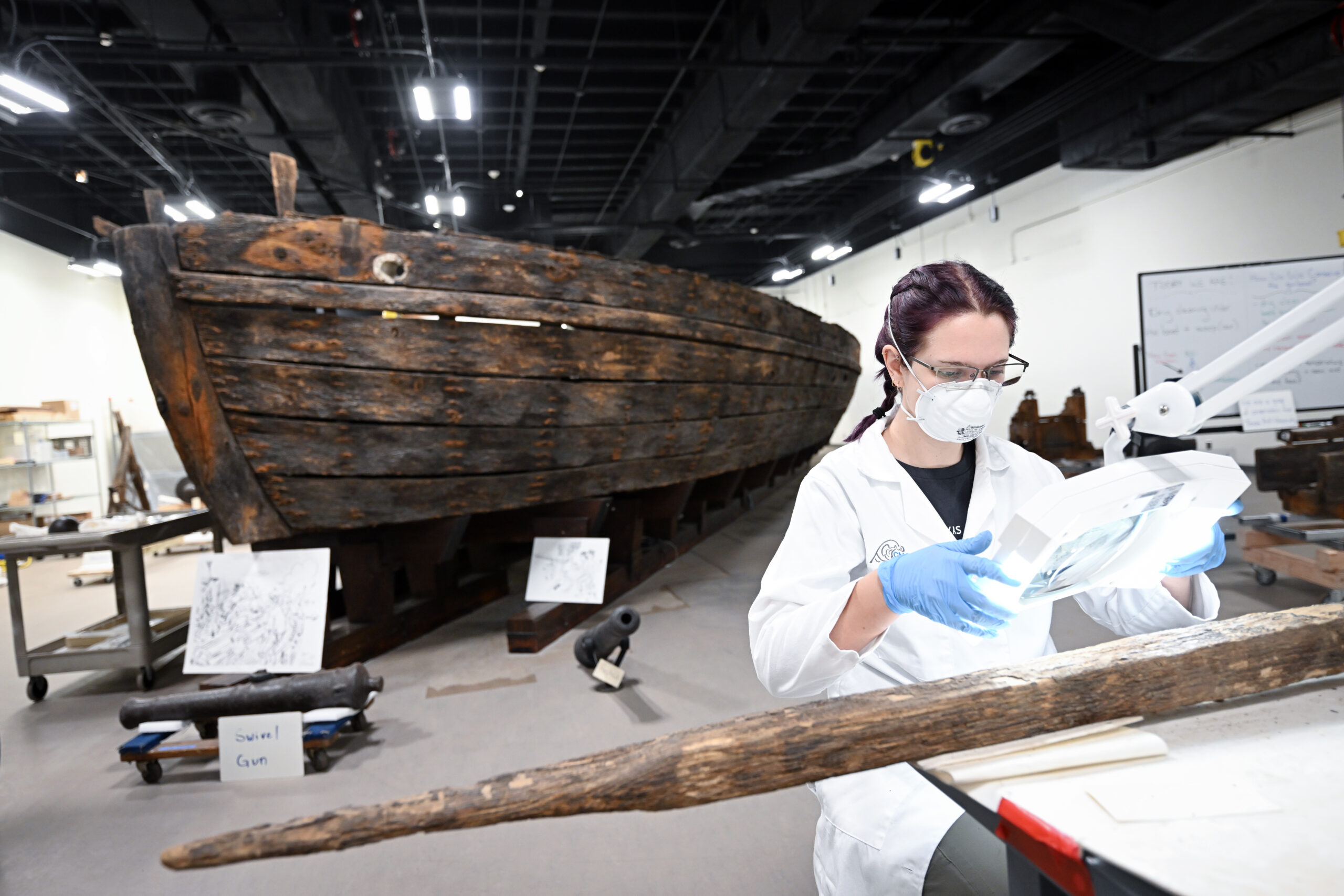 Angela Paola, a conservator at Texas A&M University, works on a preservation project of the gunboat Philadelphia at the Smithsonian National Museum of American History this month. The ship was sunk on Oct. 11, 1776 during the Battle of Valcour Island. It was retrieved from Lake Champlain in 1935.