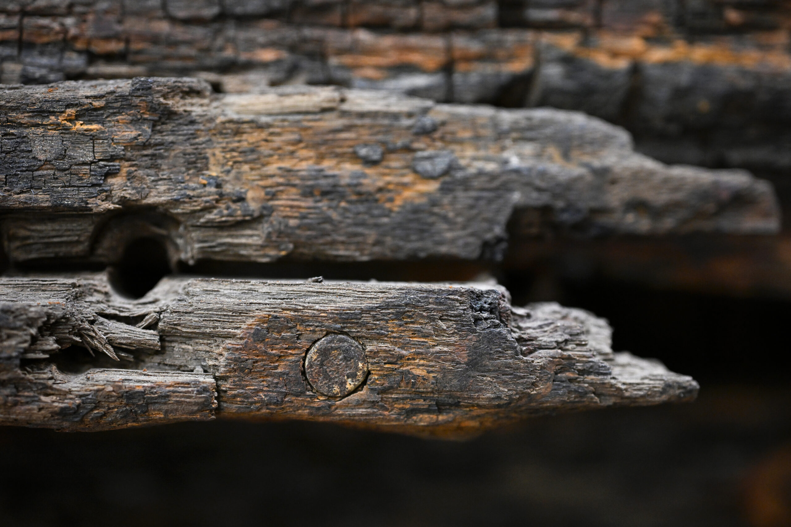The hull still bears three holes made by British cannon balls. A wooden cross piece near where the mast stood is charred, probably from the ship’s brick fireplace. The hull planks have lost about three-quarters of an inch in thickness to bacteria, Fix said.