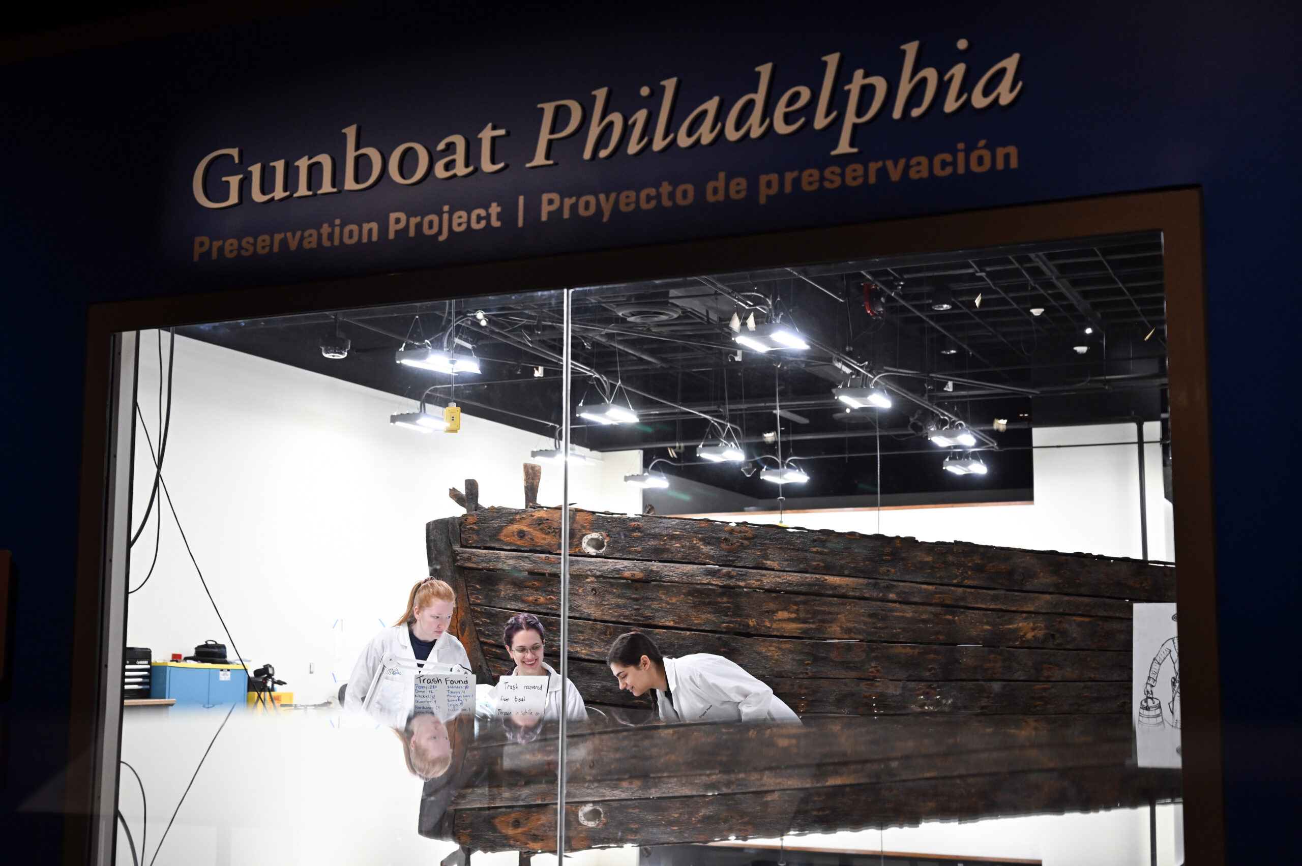 Texas A&M University research assistants Alyssa Carpenter, Marissa Agerton, and Angela Paola work on the gunboat Philadelphia, preparing it for the United States’ 250th birthday celebration this summer.