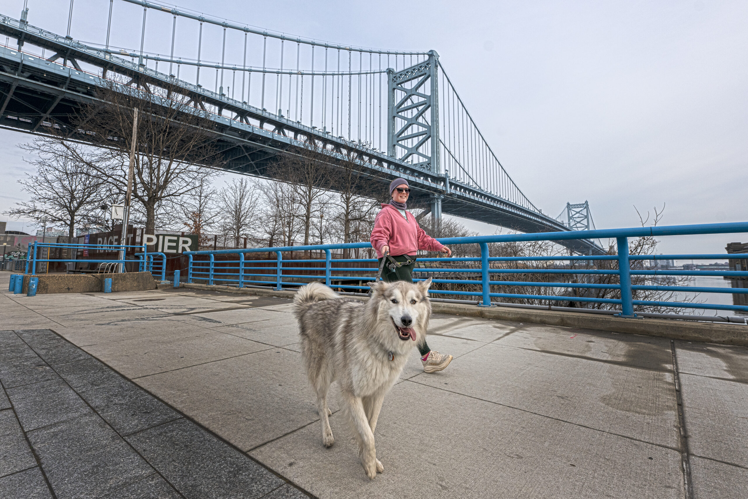 Emily Umstattd walks her dog for exercise along Columbus Boulevard.