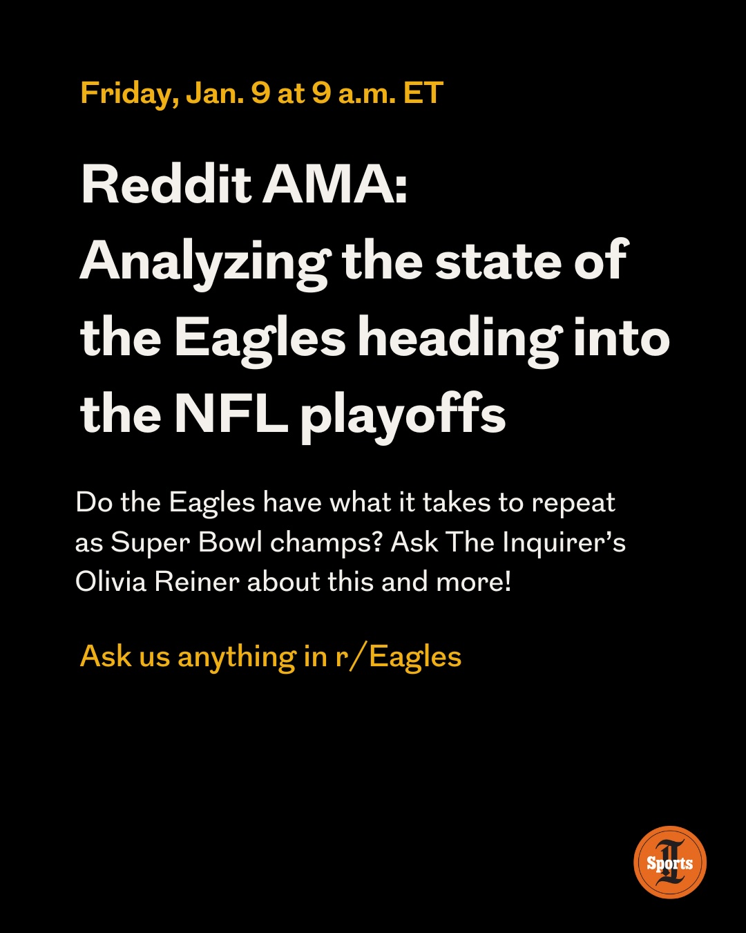 🦅 Heads up, Eagles fans: It’s playoff time in Philadelphia, which means you probably have a lot of questions about the Birds. Eagles beat reporter Olivia Reiner is ready to answer them during a Reddit AMA in r/Eagles today. Join the conversation at 9 a.m.