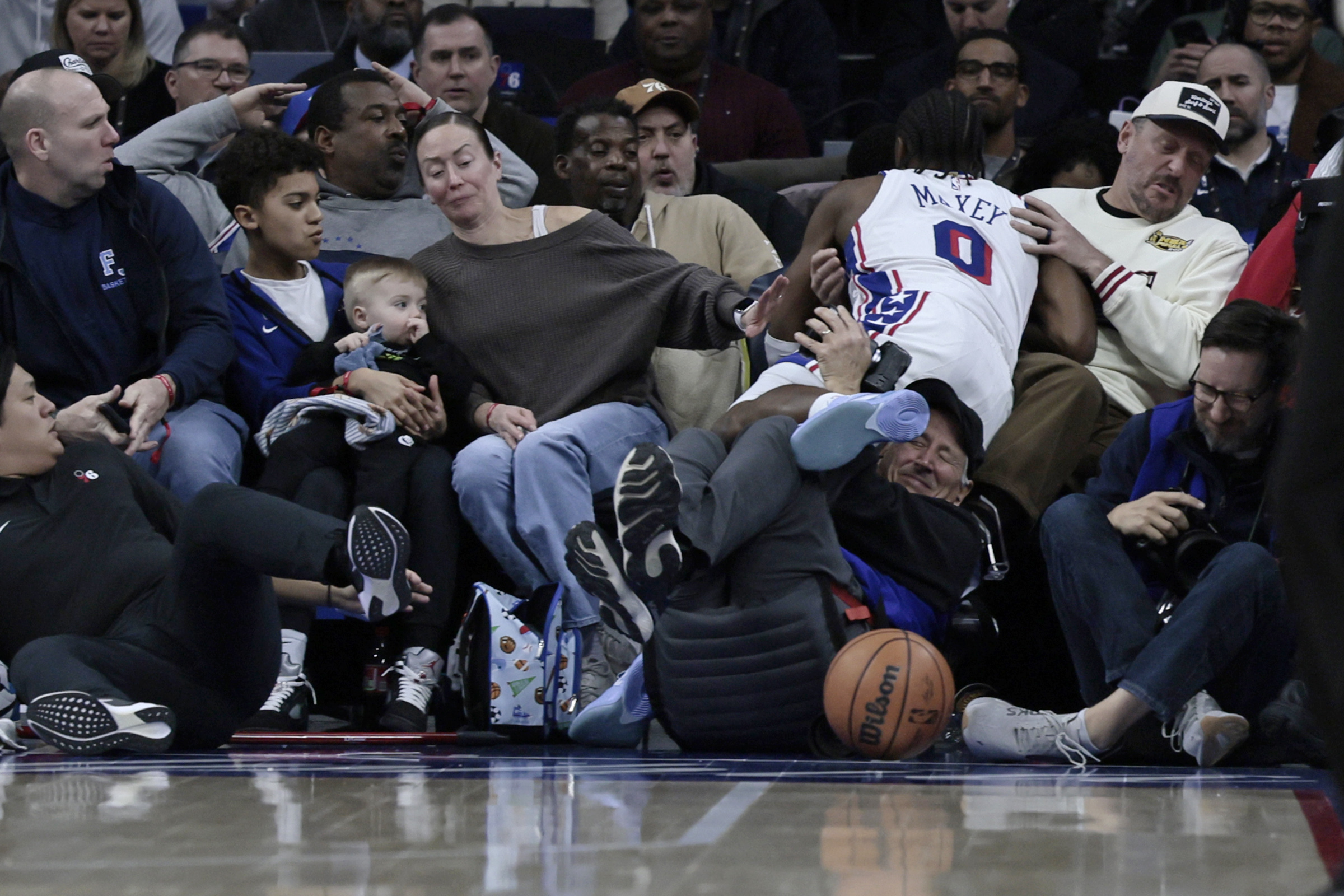 Tyrese Maxey lands in the crowd after diving for a loose ball during Tuesday’s game against the Suns.