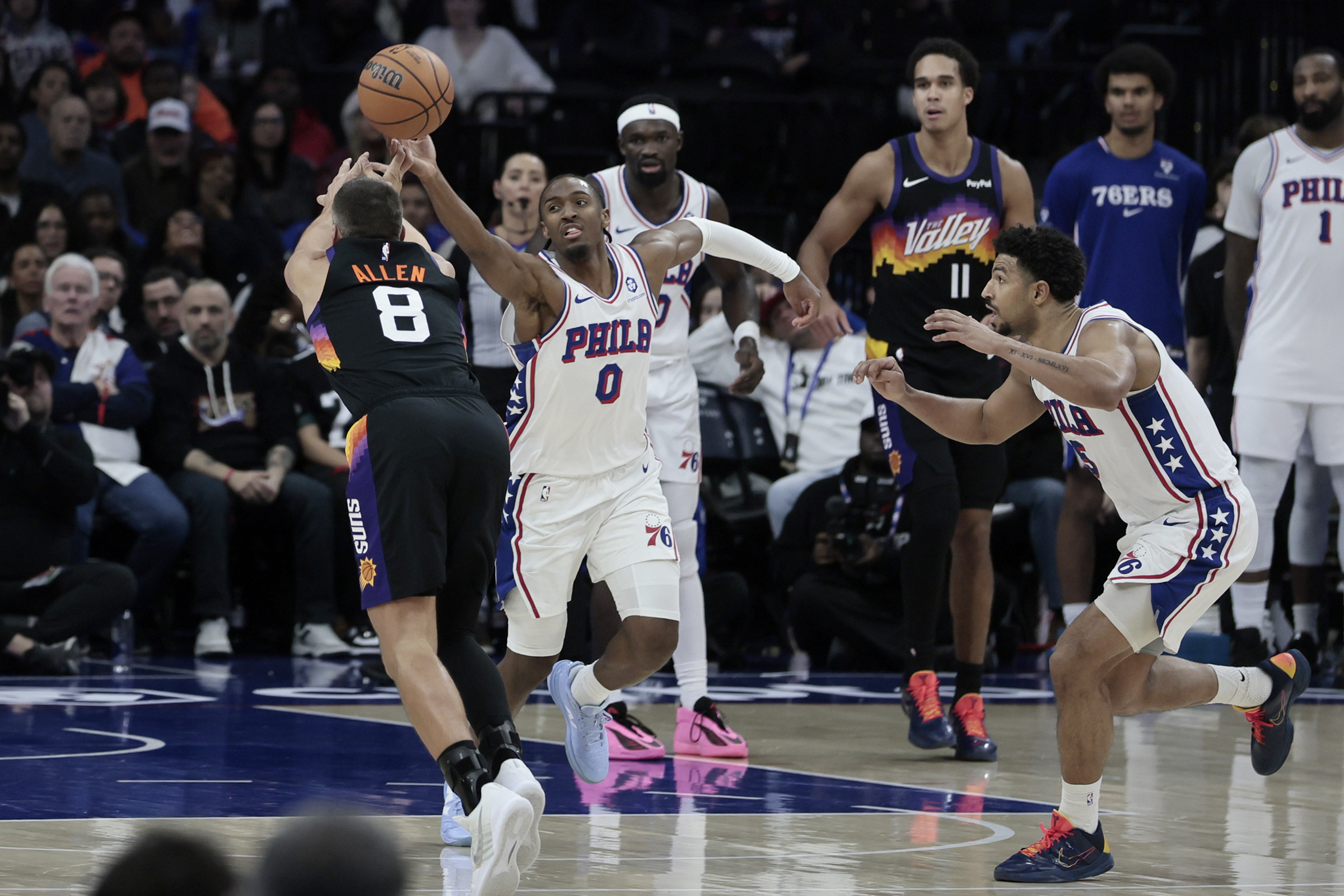 Tyrese Maxey gets to a loose ball before the Suns’ Grayson Allen in the second half of Tuesday’s game against the Suns.