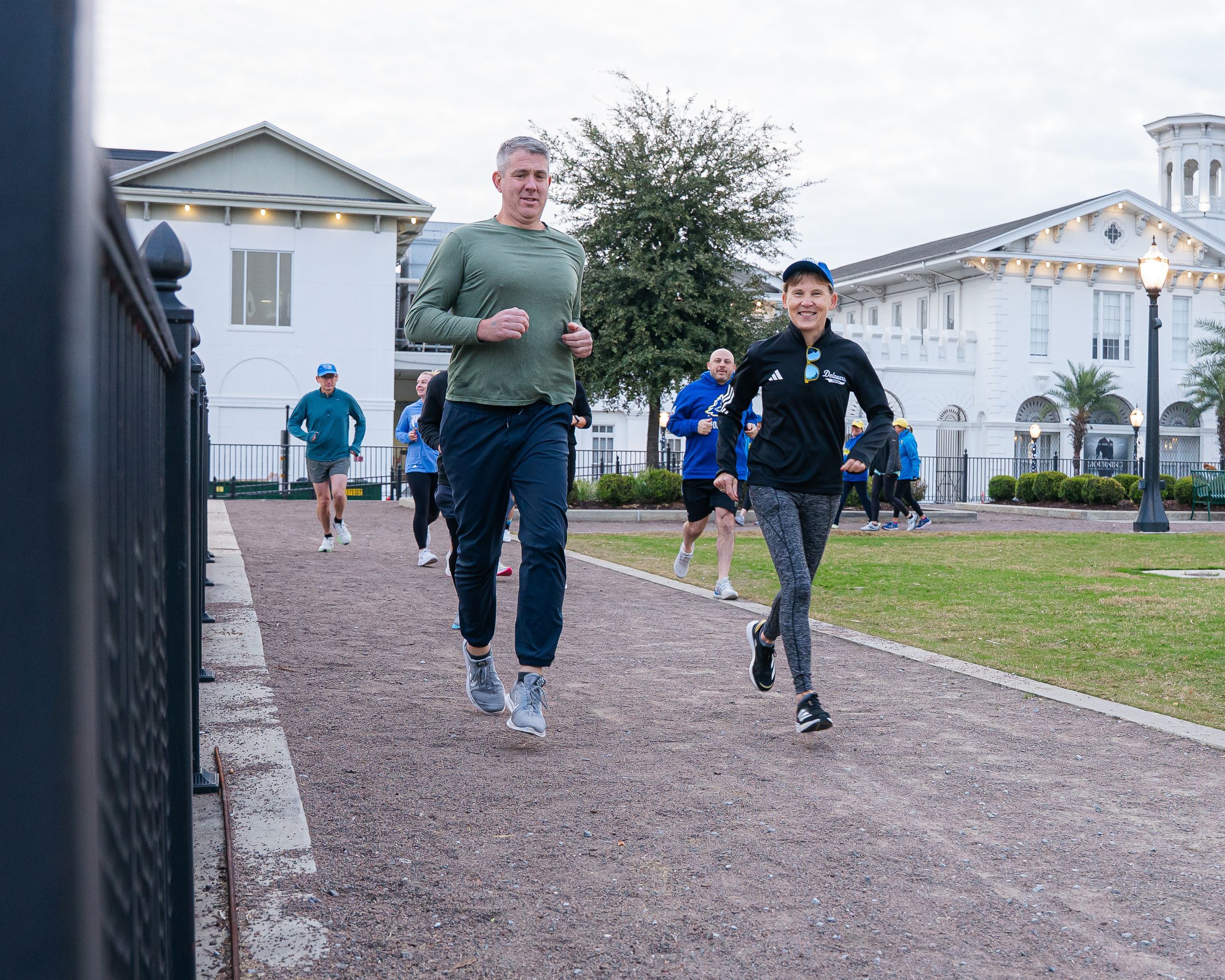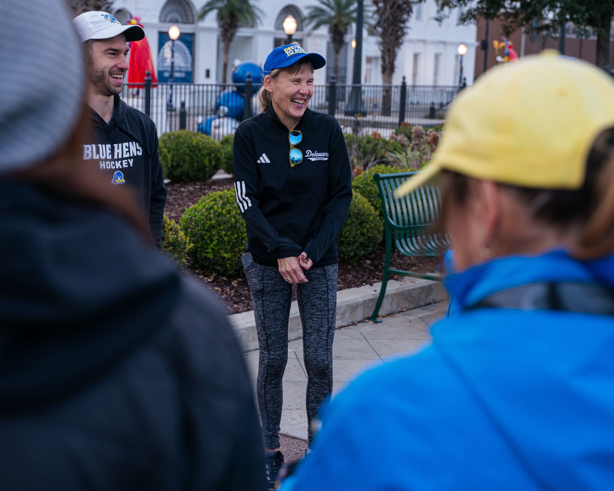 University of Delaware president Laura Carlson (right) goes on one of her Prez Runs in Mobile, Ala., where the Blue Hens won a bowl game, defeating Louisiana-Lafayette 20-13 on Dec. 17, 2025.