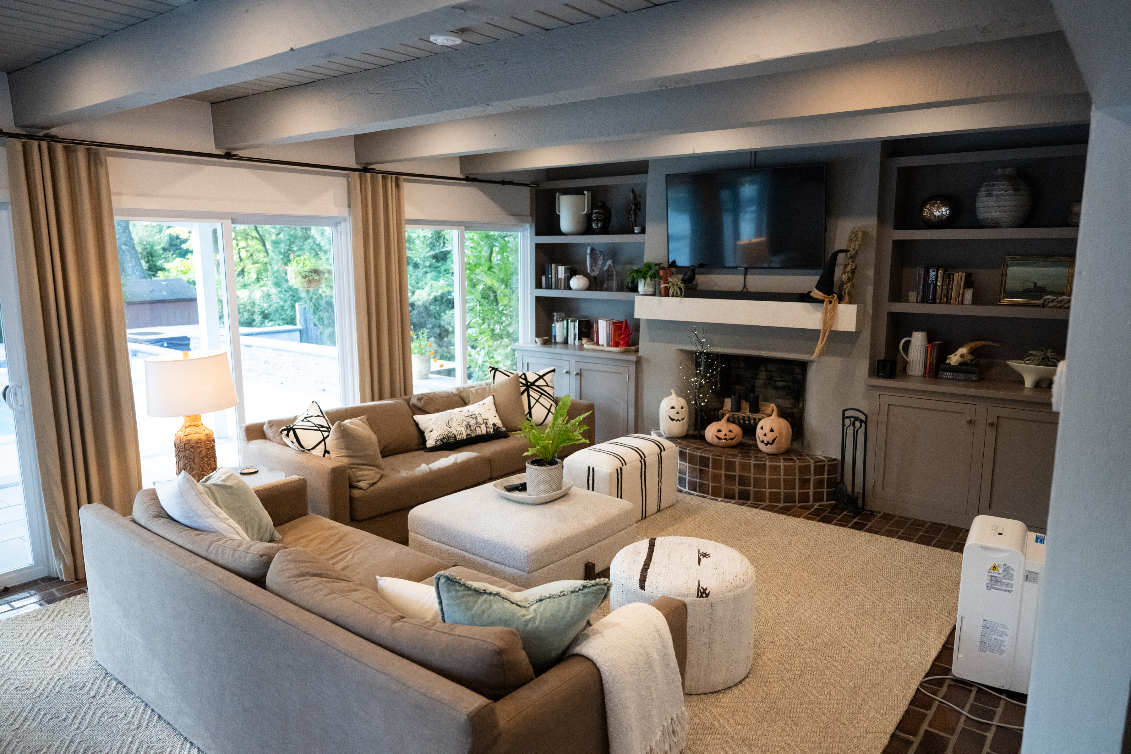 Those included custom bookshelves, a new metal mantle for the wood-burning stove, and extended ceiling beams. They also replaced all of the original lighting with a combination of recessed lighting and fixtures, swapped out the window treatments, updated the HVAC system, and added pavers to the backyard.