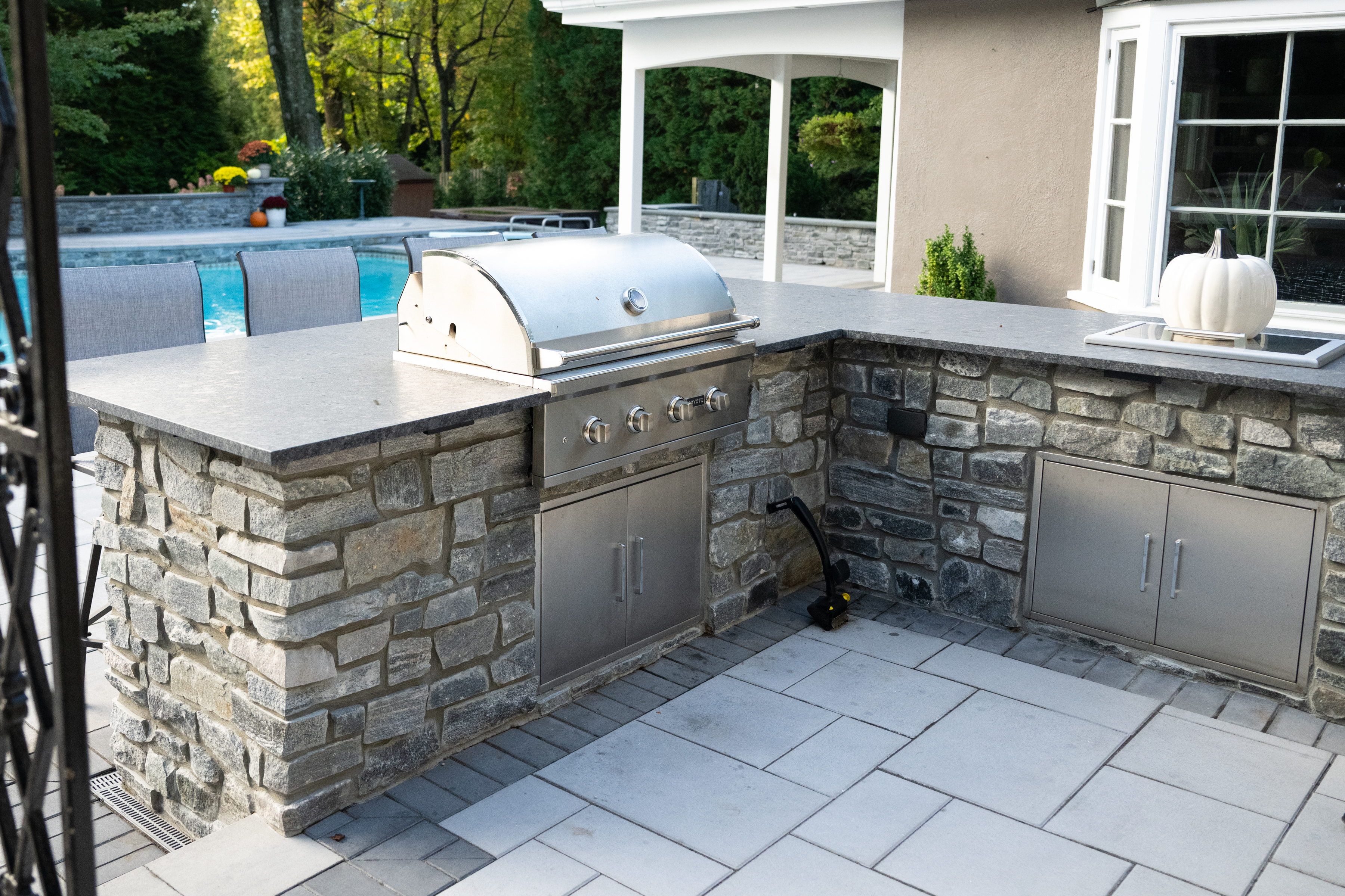 The backyard is where the family spends as much time as possible, swimming, hanging in the hot tub, lounging by the pool, warming up at the fire pit, or barbecuing. With help from All Seasons Maintenance & Design, Melady Landscaping, and Bloom Design, they created a cozy, inviting outdoor retreat.