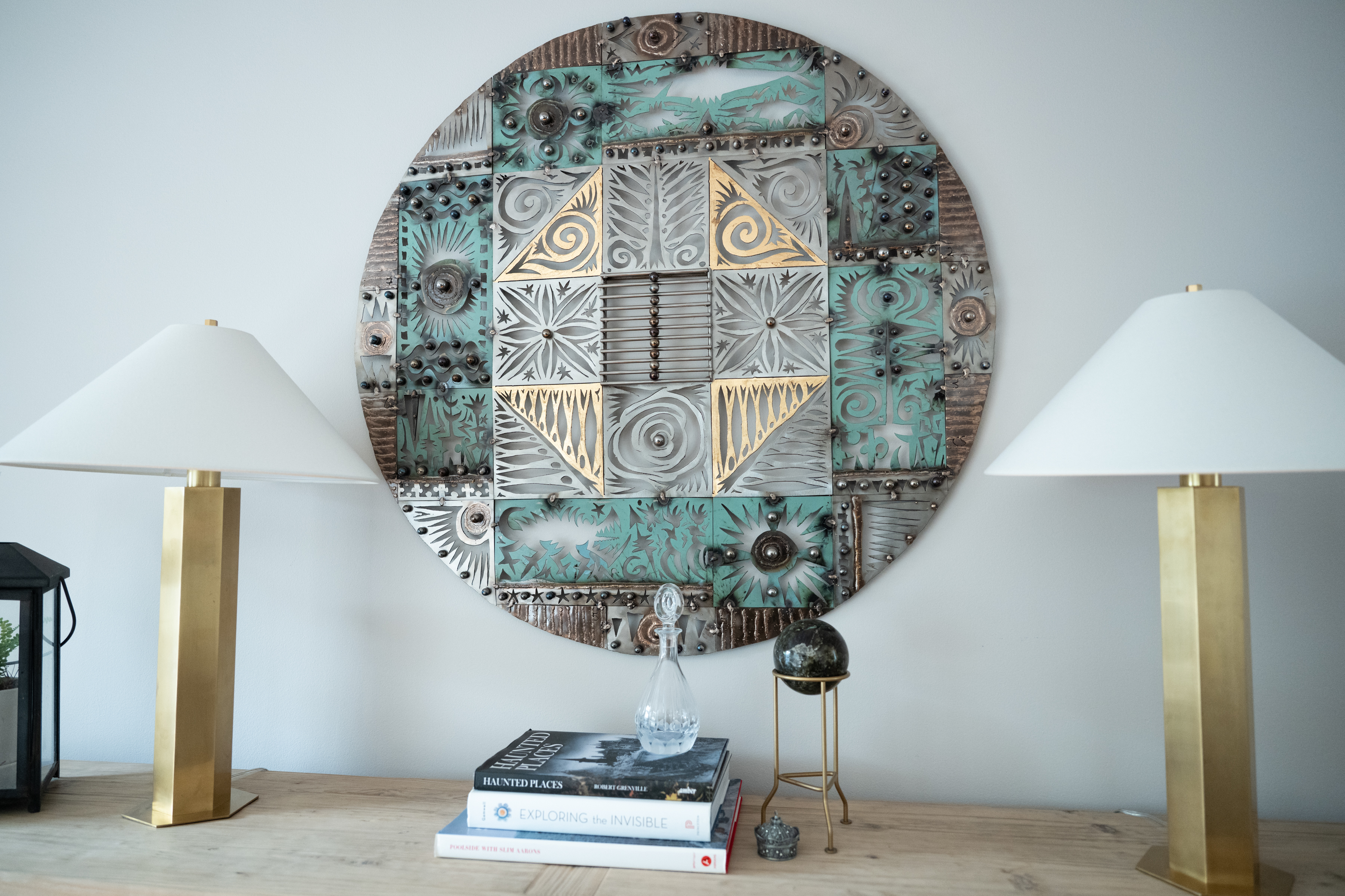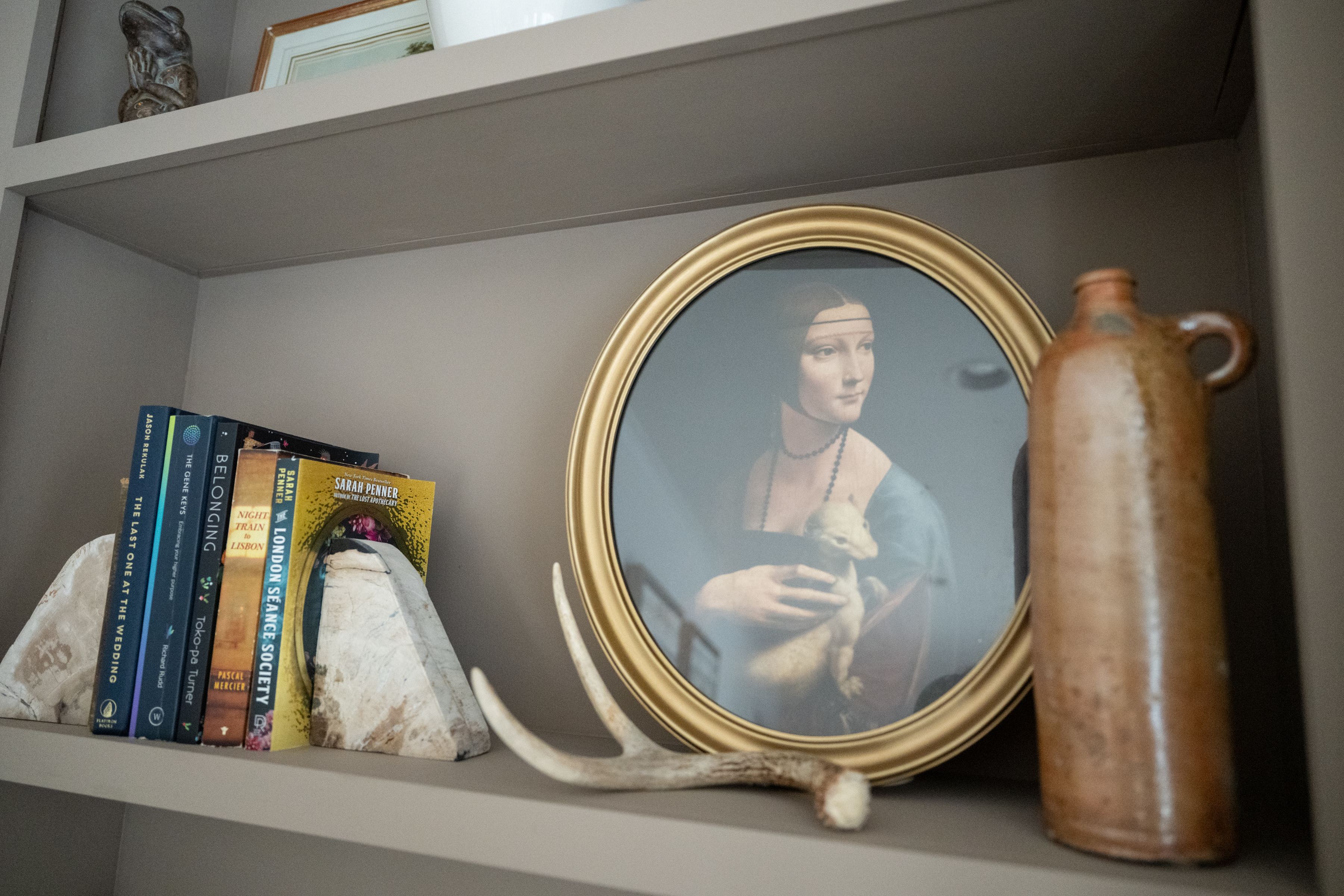 A reprint of the painting “Lady With an Ermine” by Leonardo da Vinci is pictured on a shelf in the den.Metal wall decor hanging on the wall of the den.Steve Peikin’s home office. When they bought the home, the couple wanted space for two home offices.The mudroom and arched entryway.