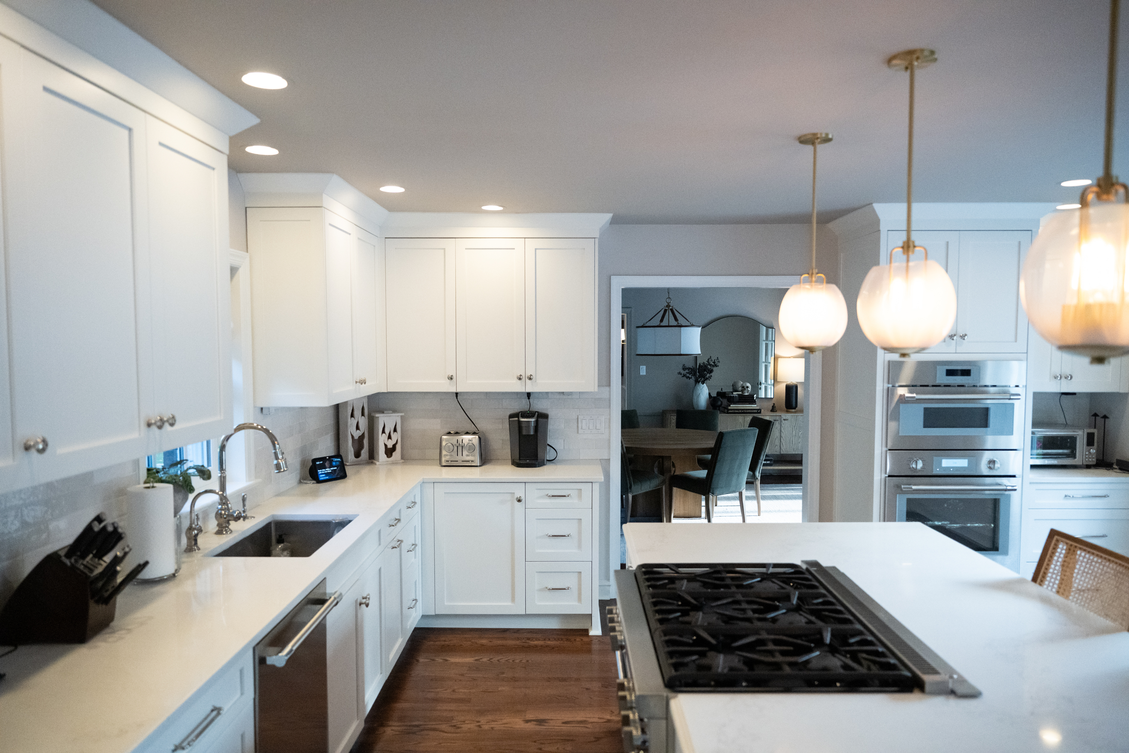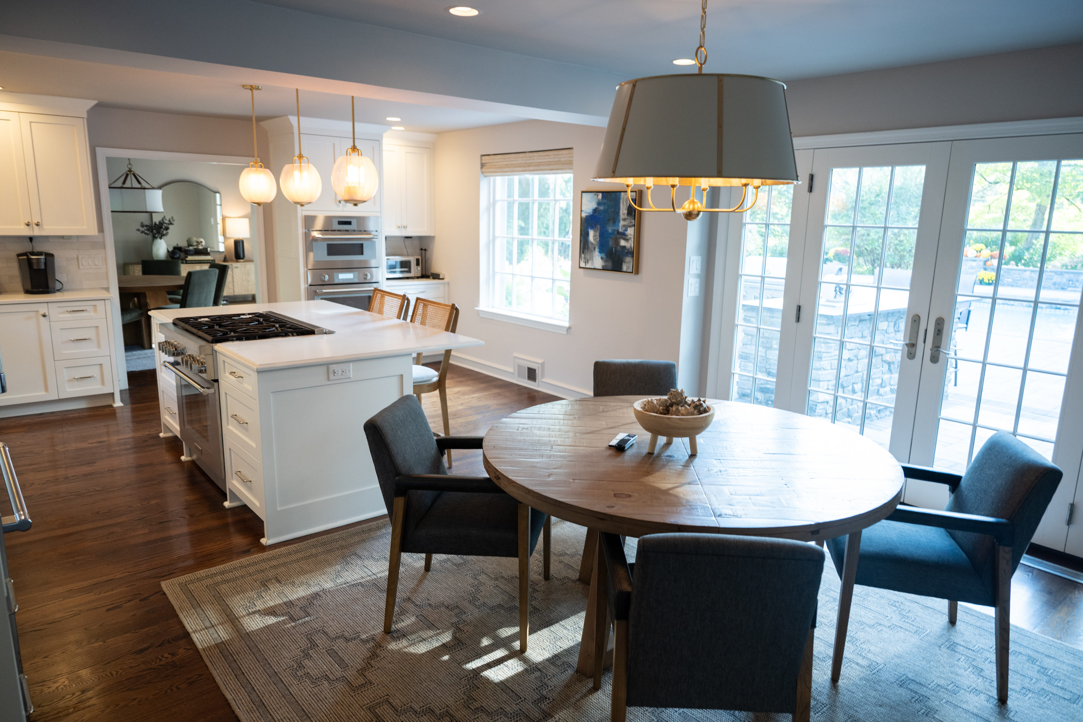 Steve Peikin and Amy Spicer’s living room was one of the spaces they updated in renovations.The kitchen and dining area, which looks out on the backyard.The renovated kitchen features Thermador appliances and a stone island with a built-in stove. Decor in the den.