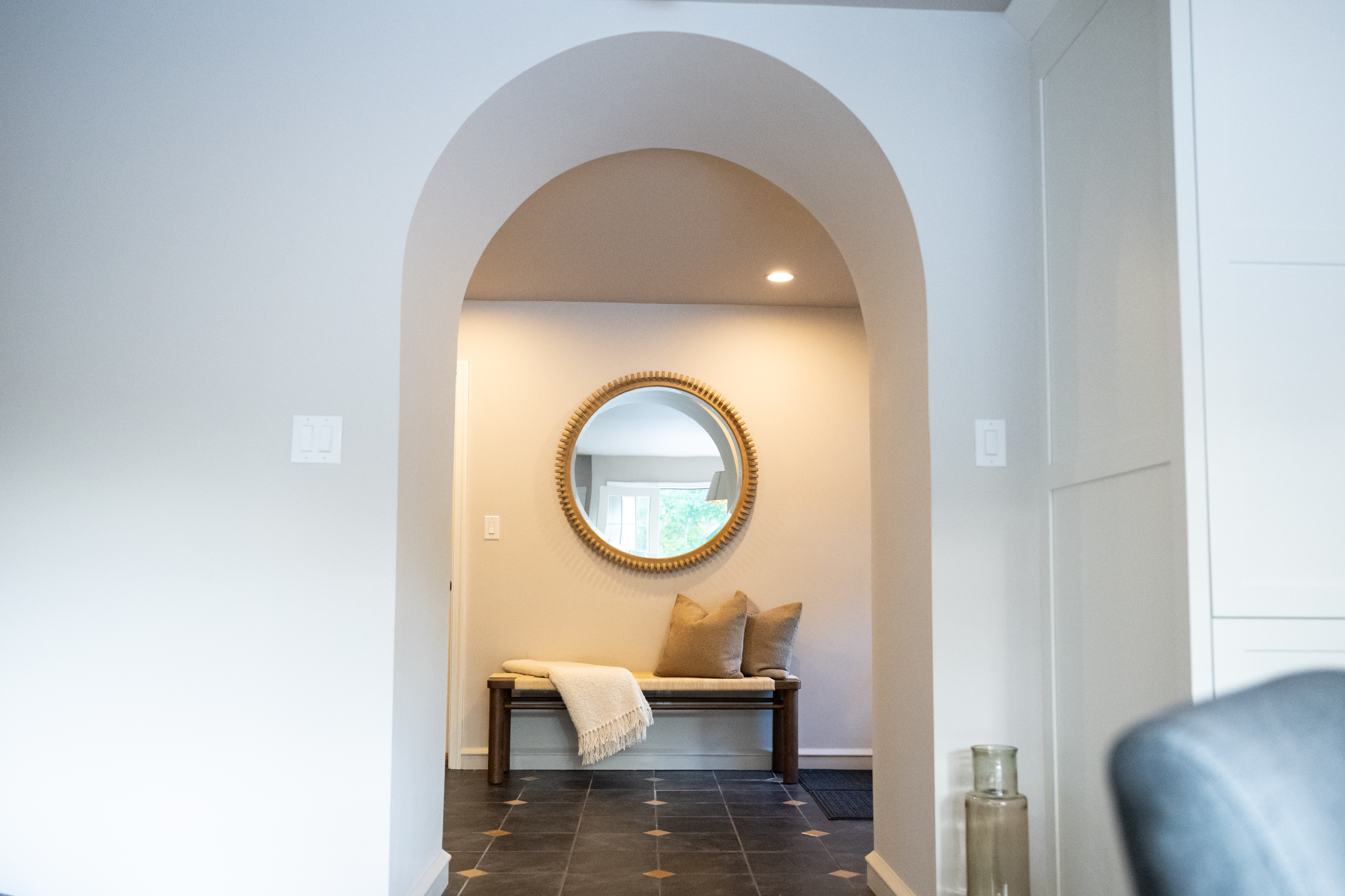 The mudroom off the garage leads to the kitchen through an arched passageway which may have been an addition to the original house built in 1950, Peikin said. The mudroom floor features black and gold tile and a huge inlaid wooden chest that they call the Narnia cabinet — akin to the one in the fantasy novel The Lion, The Witch and The Wardrobe — sits against one wall.