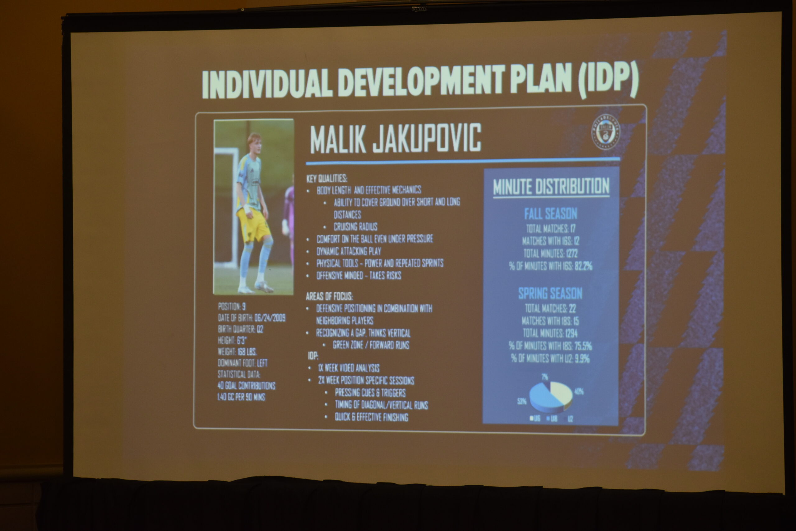Later in the presentation, he posted a detailed slide showing an example of an Individual Development Plan. The player on the slide happened to be 16-year-old striker Malik Jakupovic, the team’s second-most-hyped prospect right now after Cavan Sullivan.