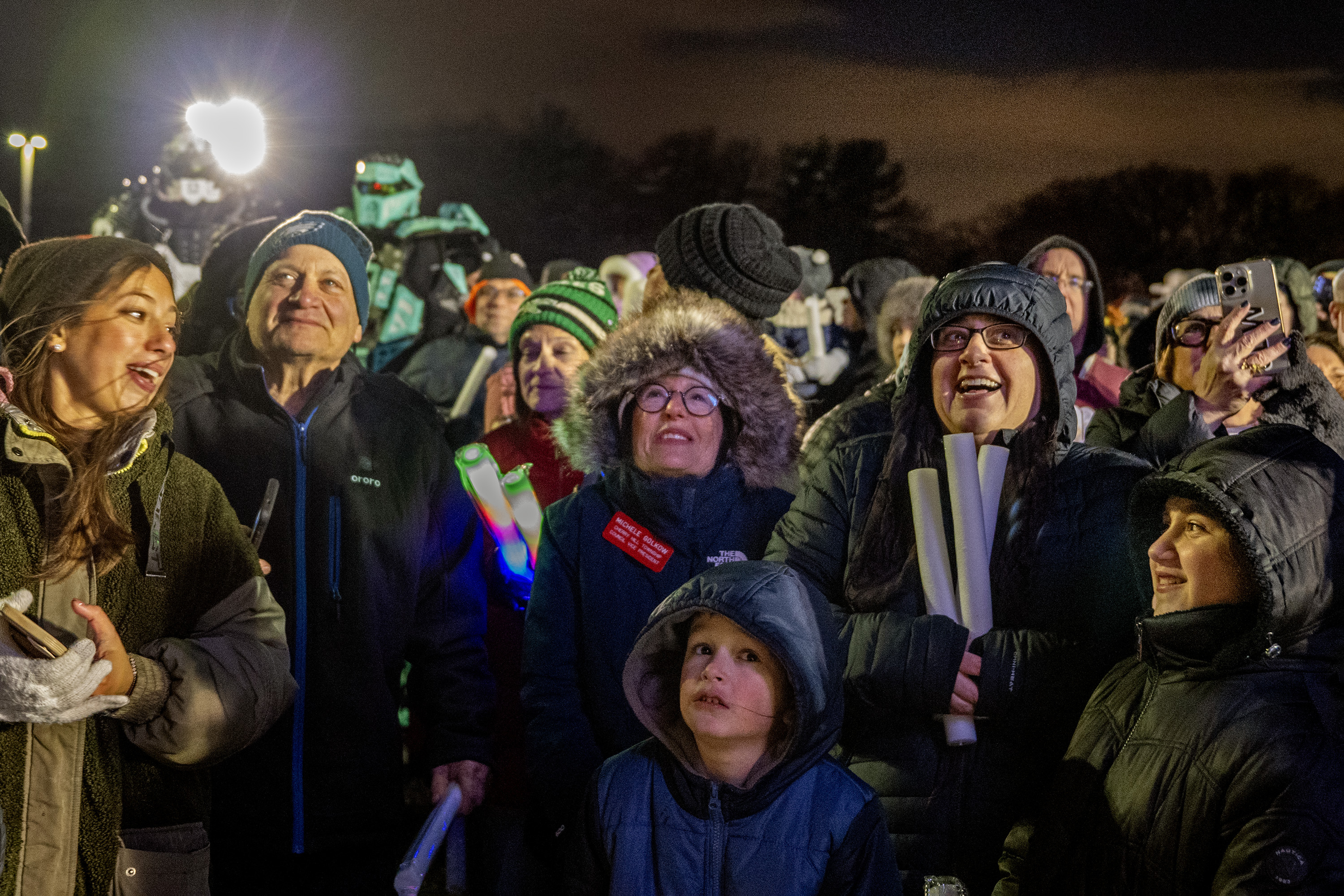 The audience watches the lighting of 18 ft. menorah by Chabad Lubavitch in Cherry Hill Sunday, Dec. 14, 2025.