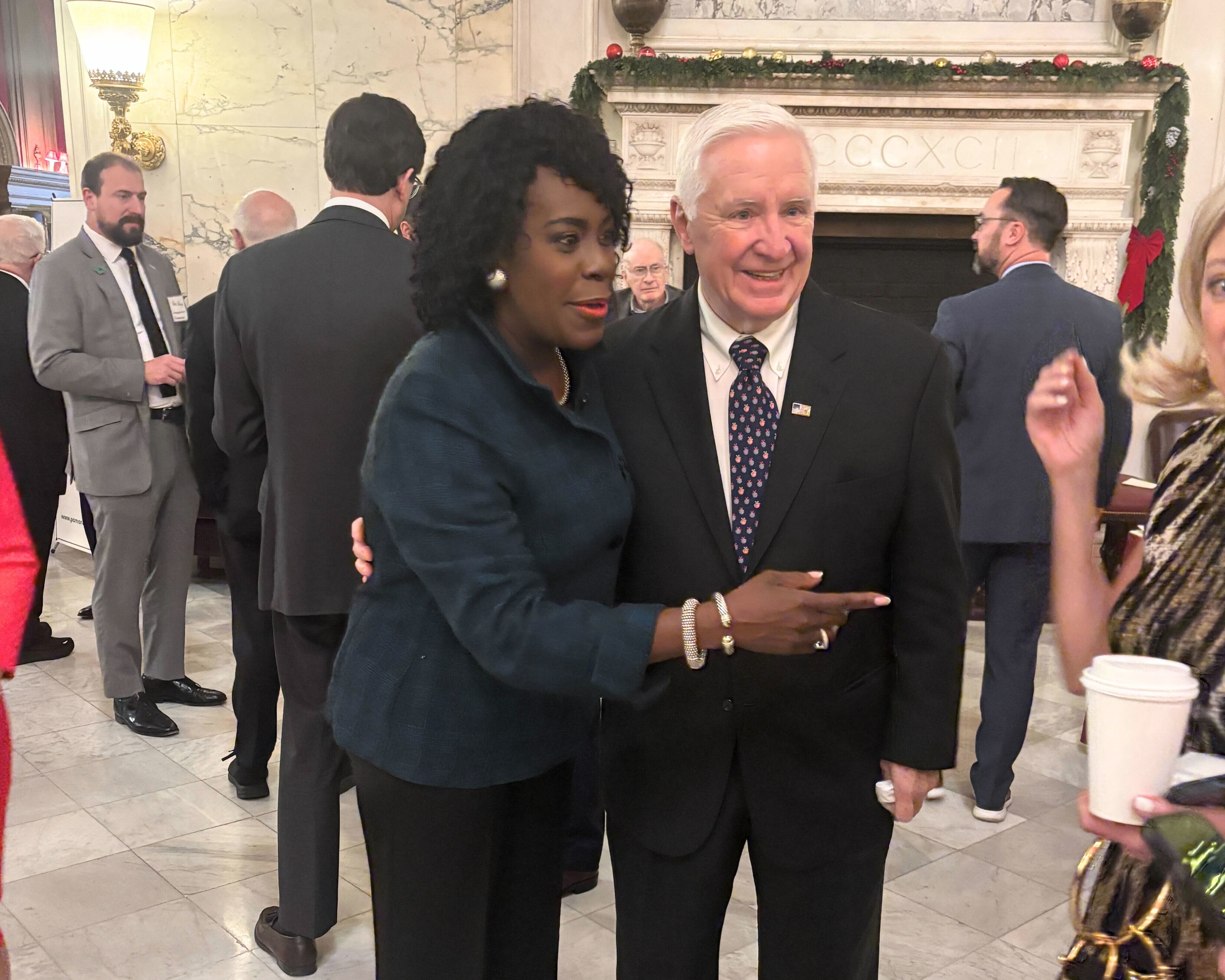 At the PMA luncheon, Parker embraced former Gov. Tom Corbett and gave a warm greeting to Auditor General Tim DeFoor, both Republicans.