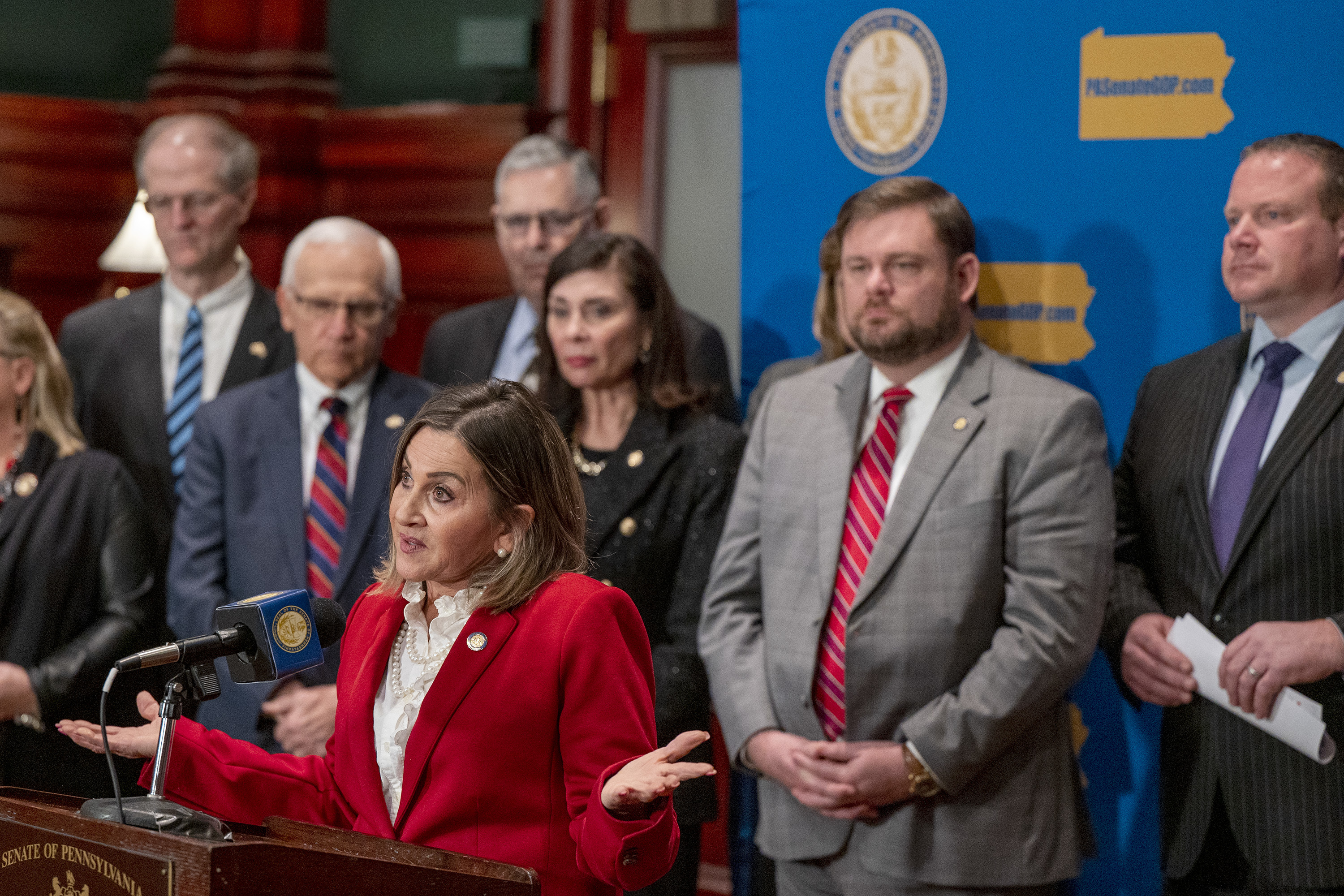 Senate President Pro Tempore Kim Ward (R., Westmoreland) speaking in February 2024 at the Capitol in Harrisburg.