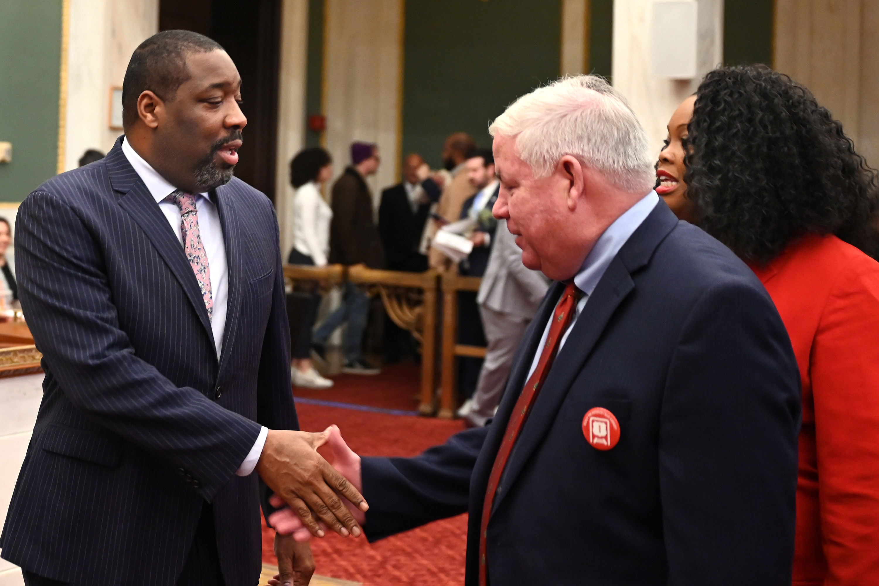In this 2023 file photo, Council President Kenyatta Johnson (left) greets 6th District Councilmember Michael J. Driscoll (center) and Councilmember At-Large Katherine Gilmore Richardson (right) before the last City Council meeting of the year.