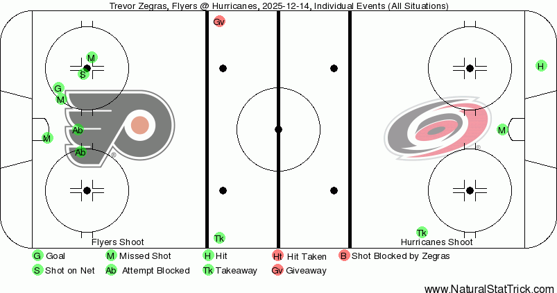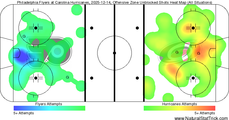 He also led the team with six scoring chances. None came during five-on-five play. Most came during six-on-five action — the Flyers scored both goals at this strength, one on a delayed penalty and the second with the goalie pulled.