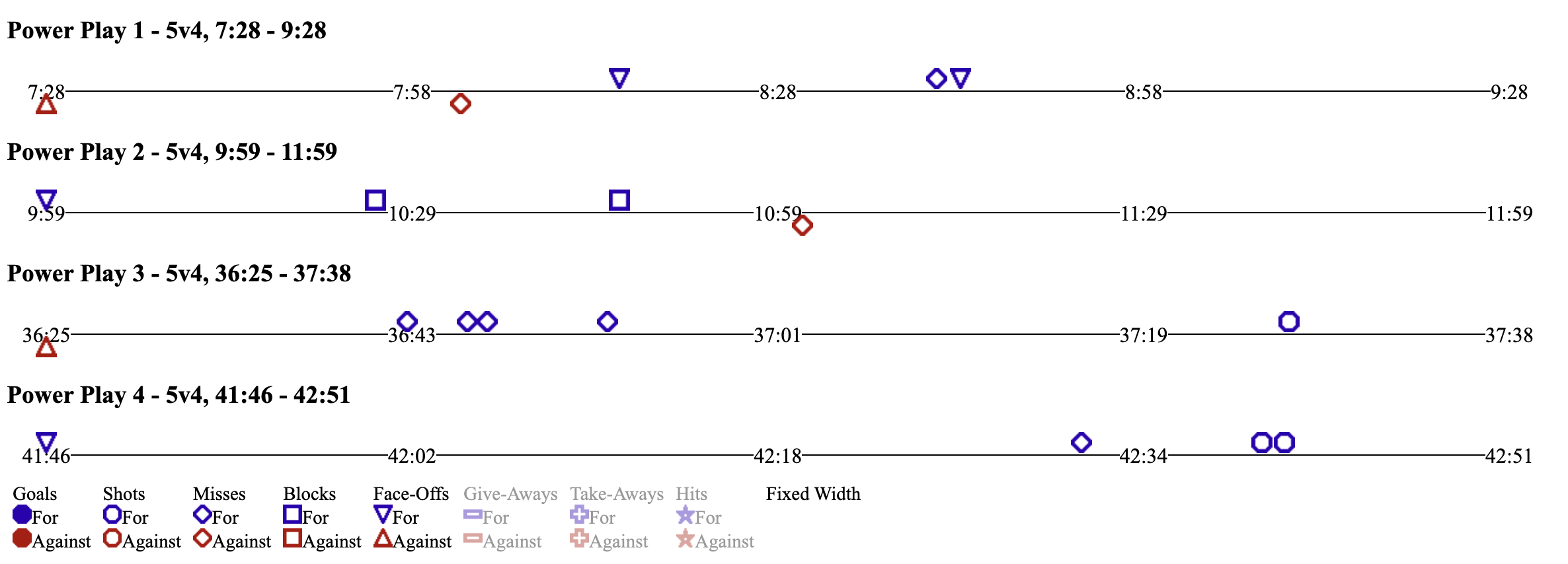 After a slow start, the new power-play units started to gel with Zegras (4:47), Cates (4:22), Tippett (4:22), Drysdale (4:02), and Brink (3:55) getting the most time with the man advantage.