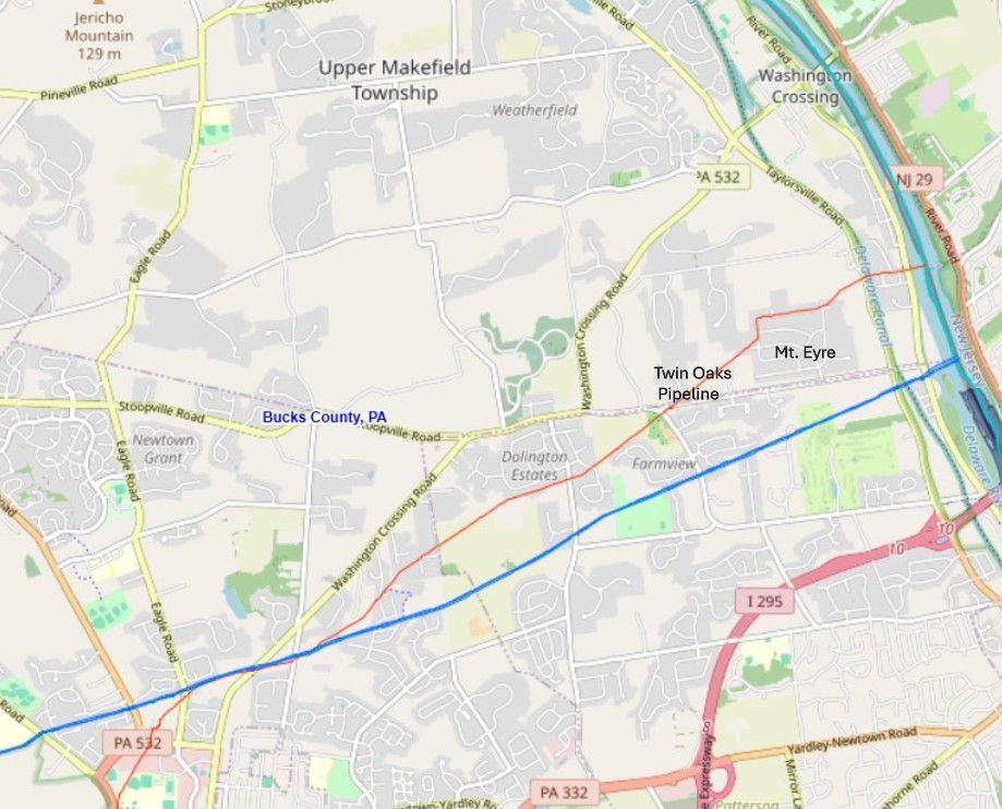 A map from the federal Pipeline and Hazardous Materials Safety Administration shows the Mount Eyre Manor neighborhood in Washington Crossing, Bucks County, and Sunoco’s Twin Oaks pipeline in red. The blue line signifies another gas transmission pipeline.