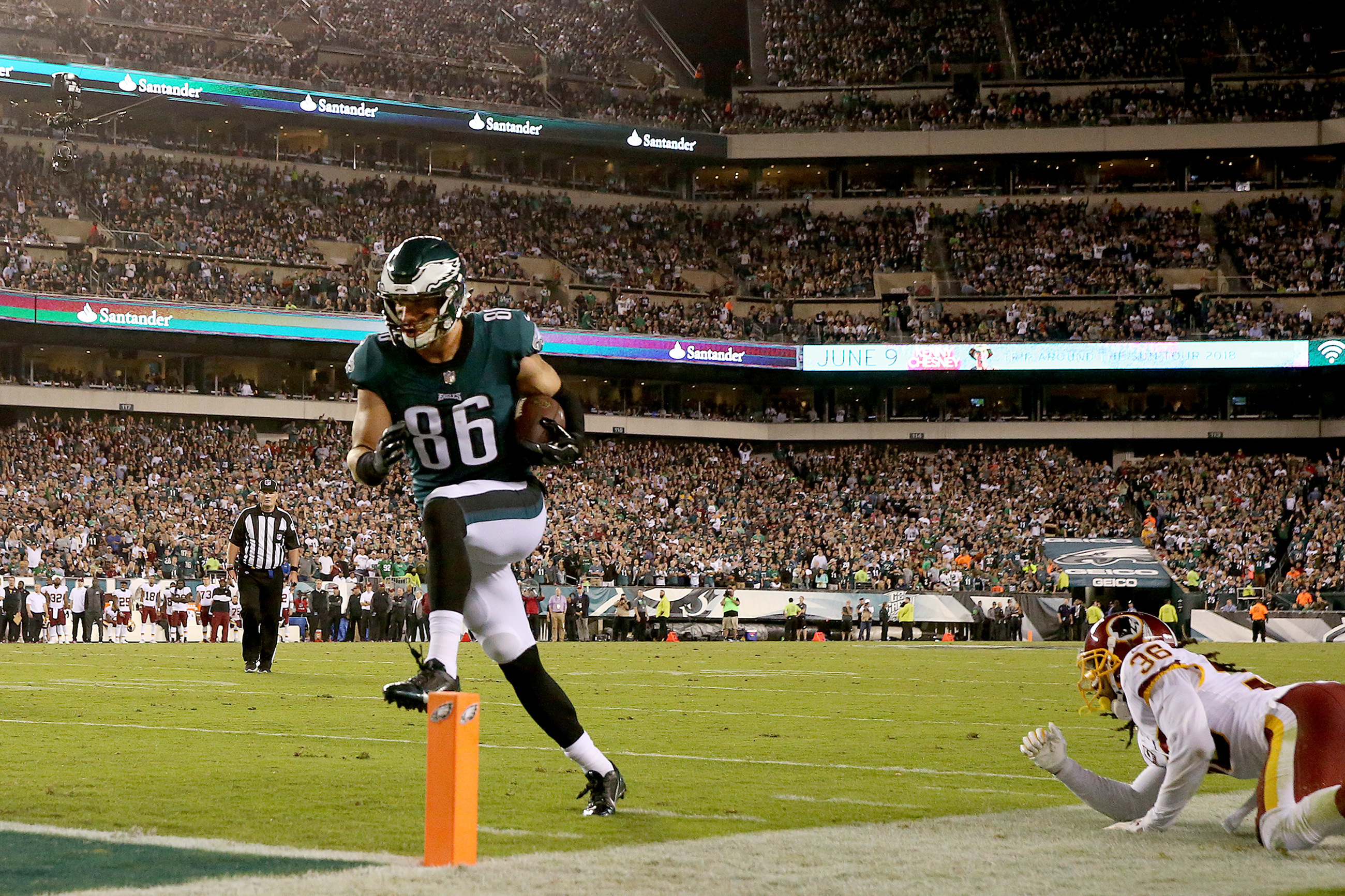 Former Eagles tight end Zach Ertz scoring a touchdown against Washington in 2017.