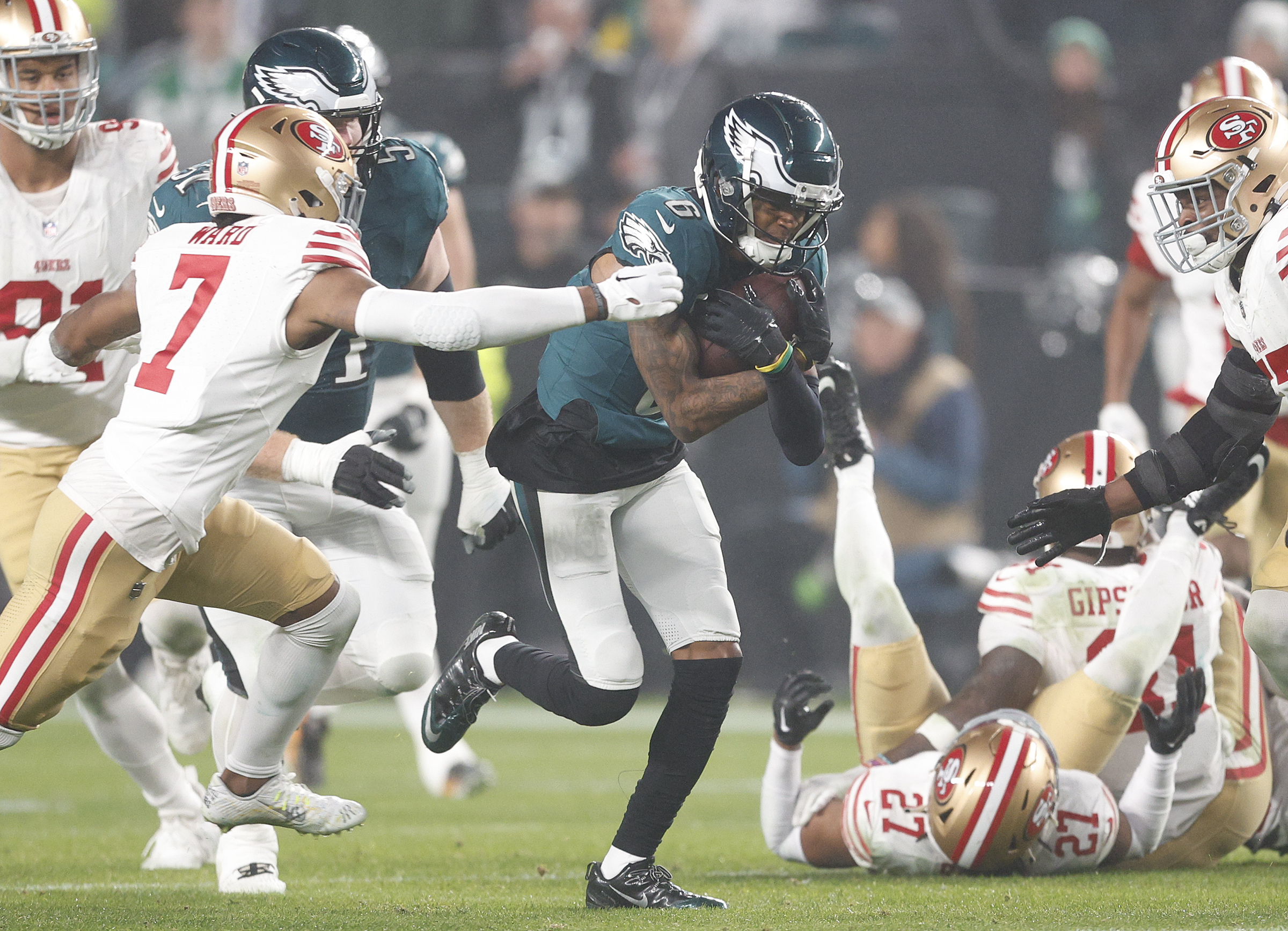 Wide receiver A.J. Brown joined Hurts and Barkley as an inactive last week, while DeVonta Smith played briefly in the final game of the regular season. Smith finished the game with three catches for 52 yards, pushing himself over 1,000 yards for the third straight season. McCaffrey had 6 catches for 34 yards and Jauan Jennings totaled 35 yards on 4 catches vs. Seattle.