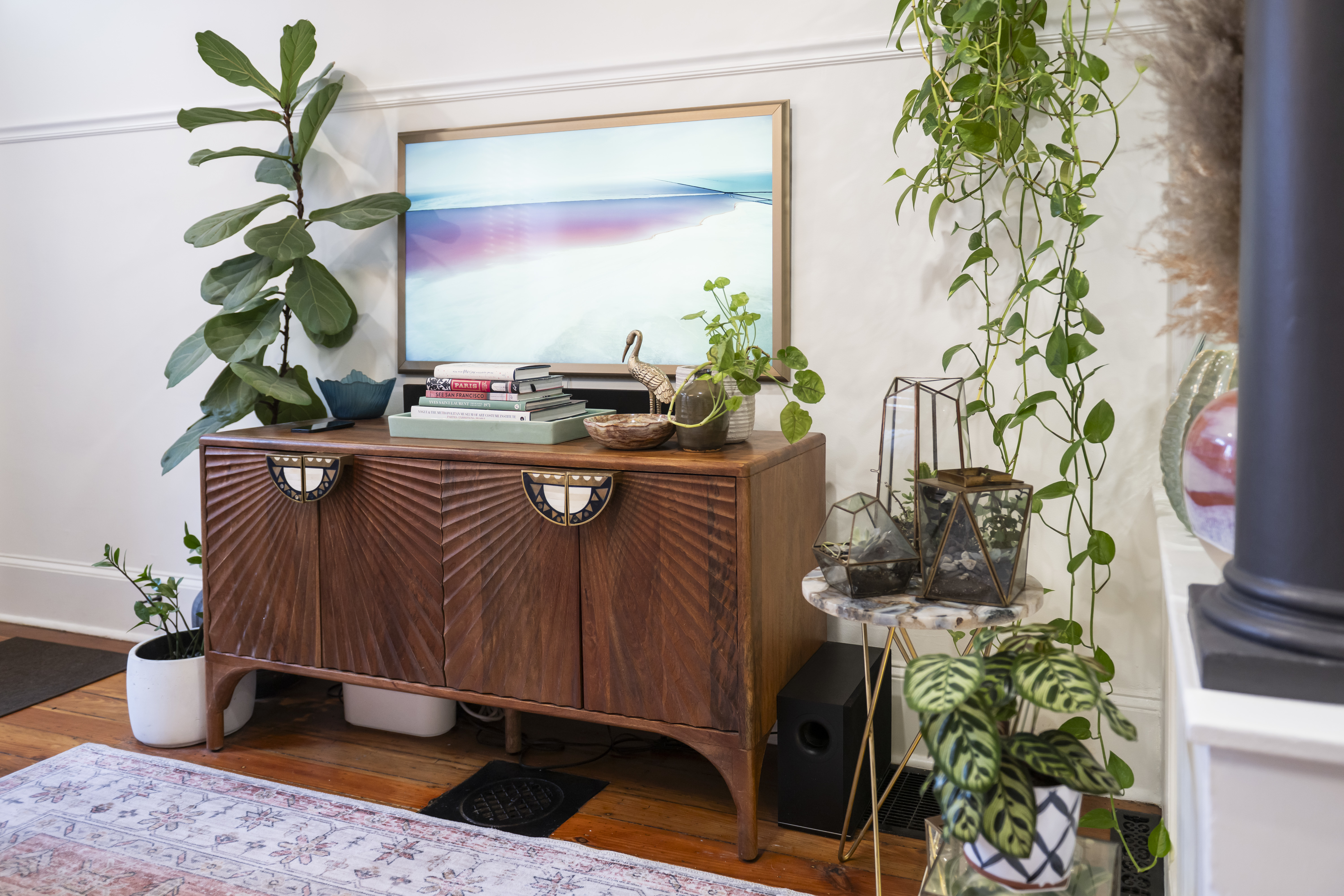 A half bathroom, so labeled in French, sits off the dining area. The backyard, with ample seating and La Reau’s herb garden.An extension of the living space, featuring colorful art and a magenta bench.The television sits above a wood cabinet with intricate details.