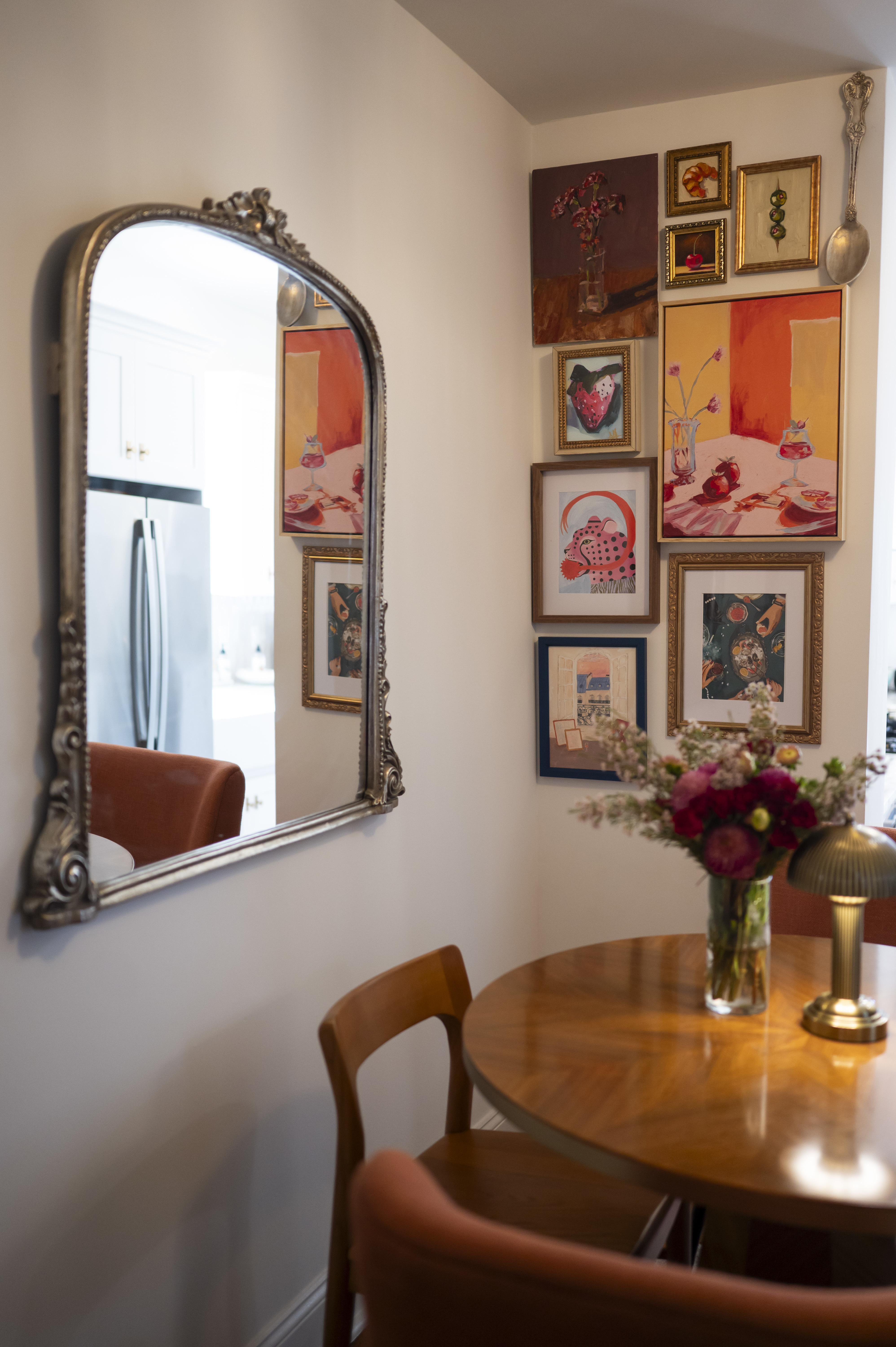 In the dining area, a collection of art in various shapes and sizes and an intricately framed mirror line the walls.The shoe wall in La Reau’s closet.