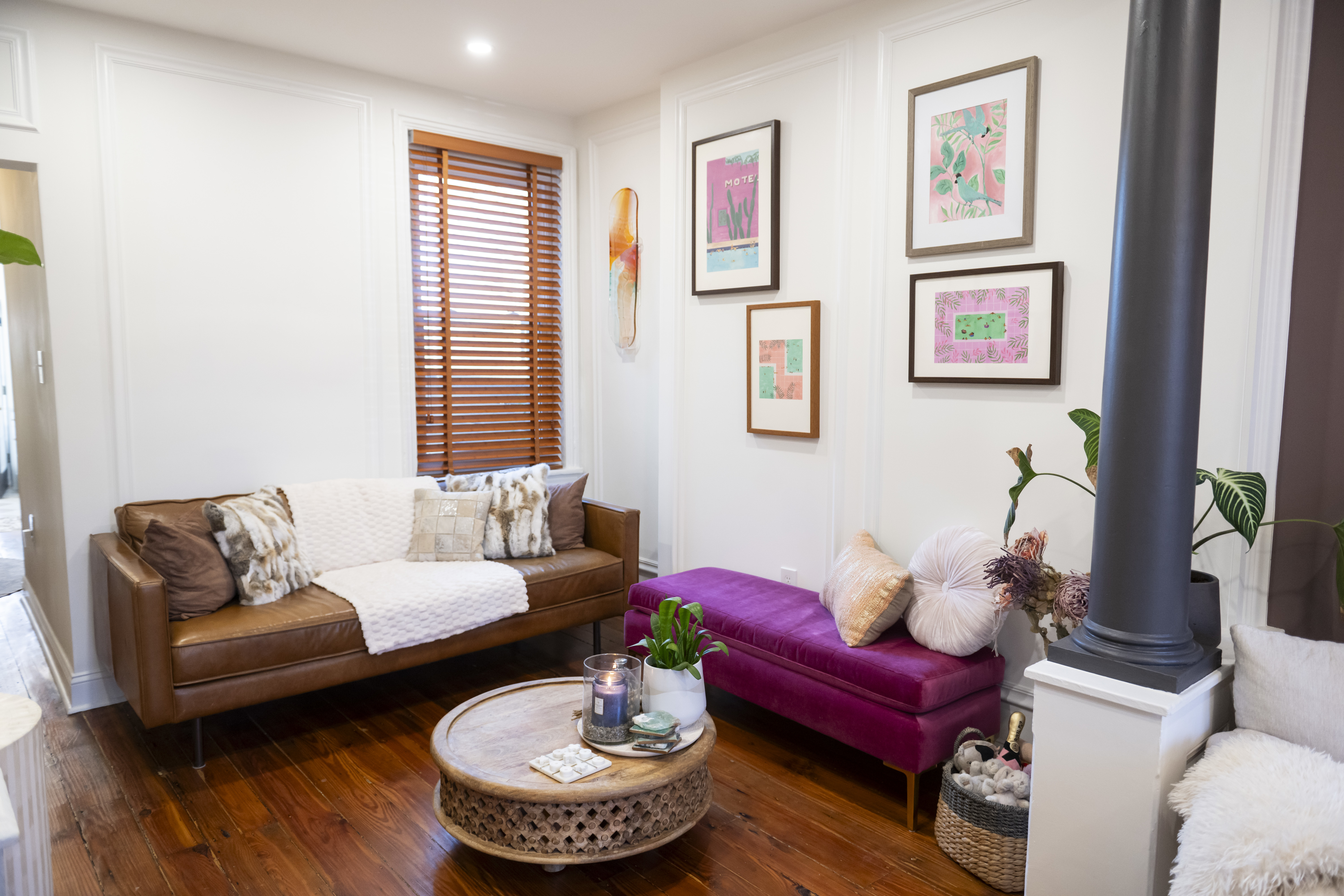 The living space features a colorful accent wall, purple details, and columns dividing the first-floor spaces.