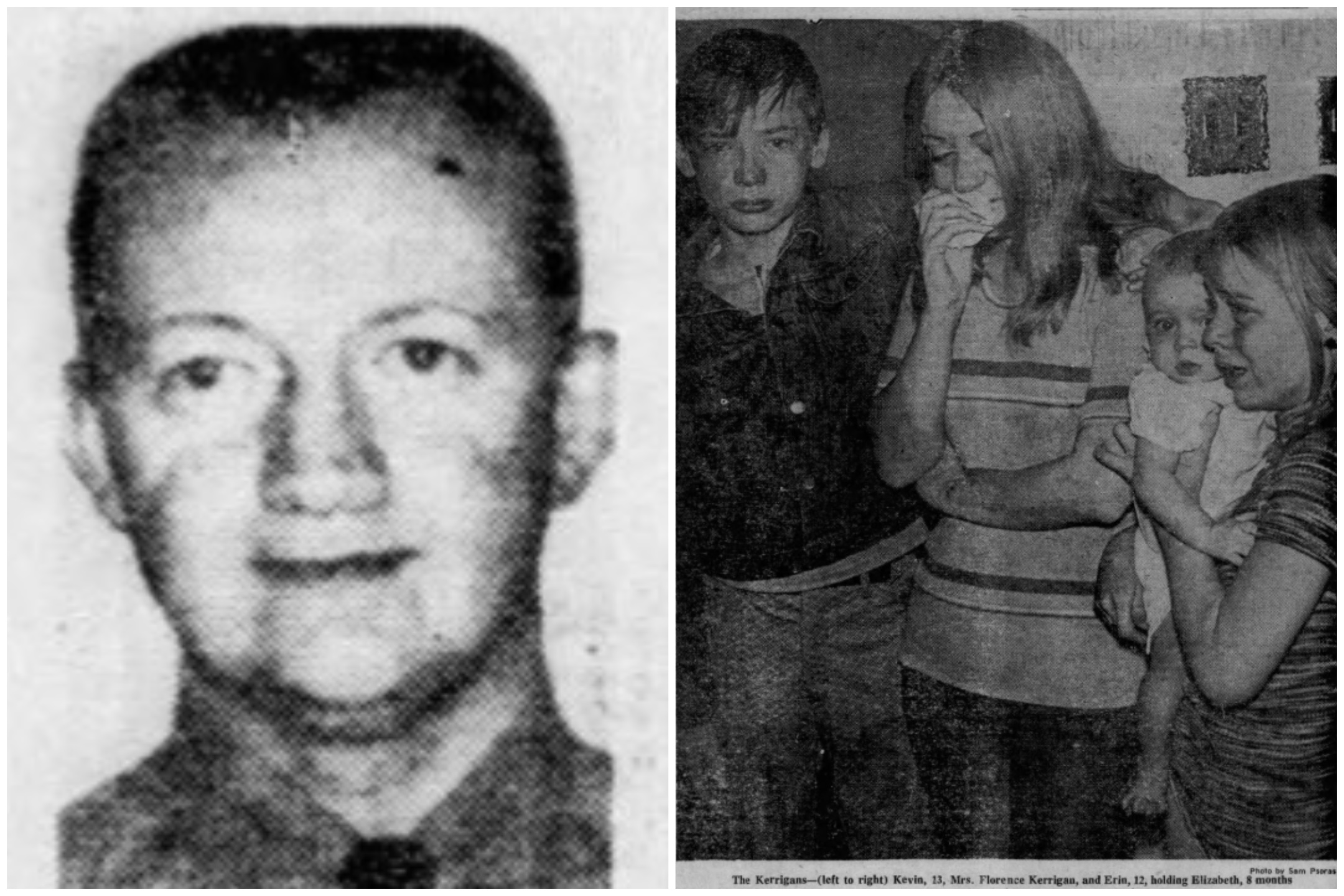 Philadelphia firefighter Michael Kerrigan, left, was killed in 1973. His family, shown in a 1973 photograph, was never the same. In the photo, from right to left, is Kerrigan’s son Kevin, wife Florence, and daughter Erin holding 8-month-old Angela.