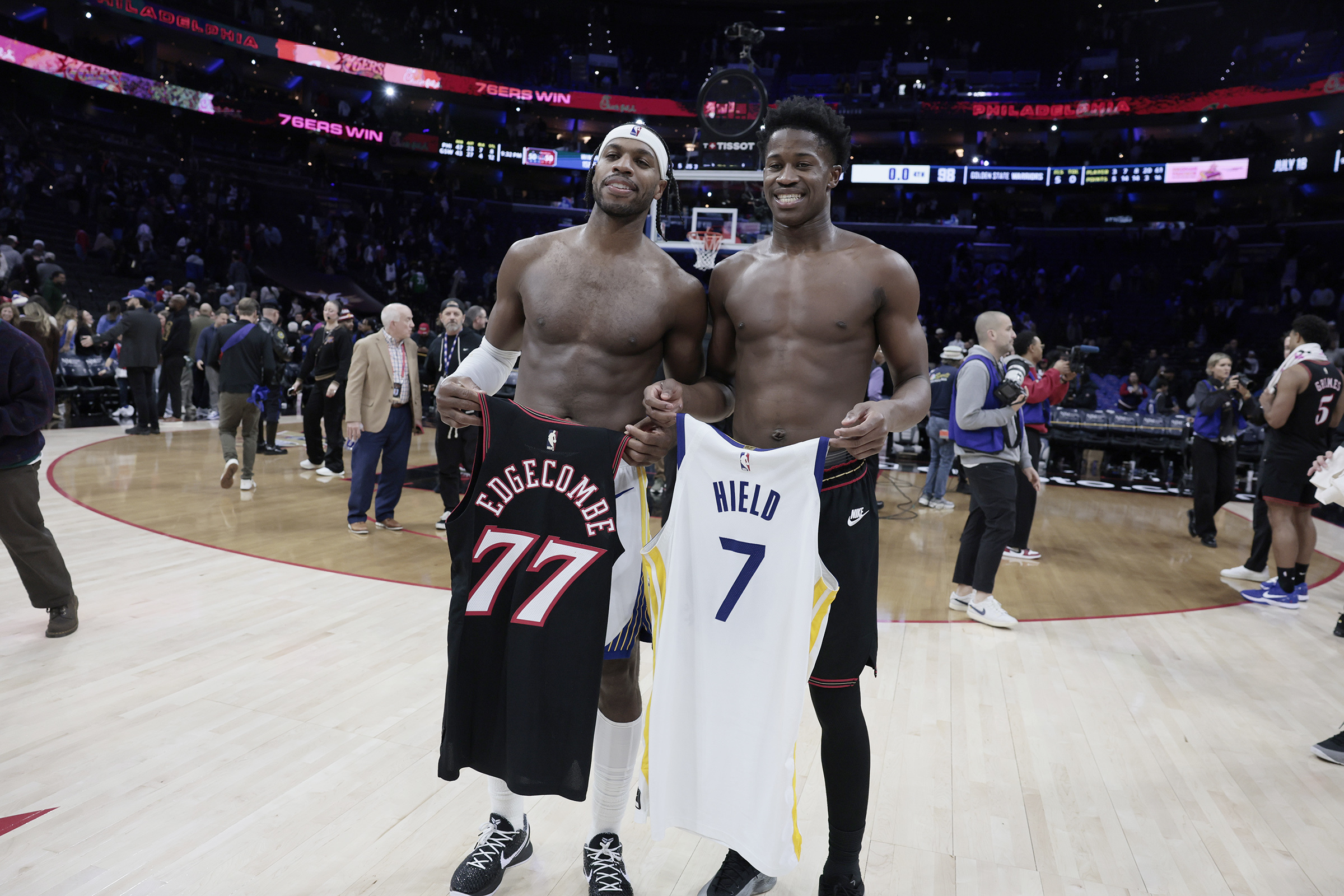 Golden State’s Buddy Hield (left) and the Sixers’ VJ Edgecombe exchanged jerseys after the Warriors played the Sixers on Thursday night.