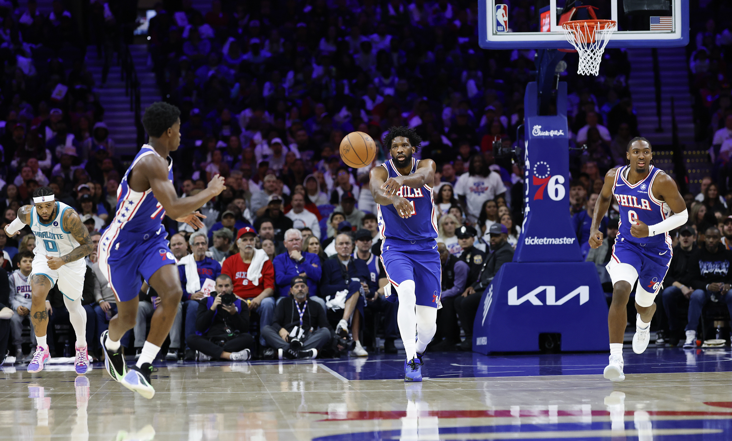 Sixers center Joel Embiid fires a pass to VJ Edgecombe on Saturday.