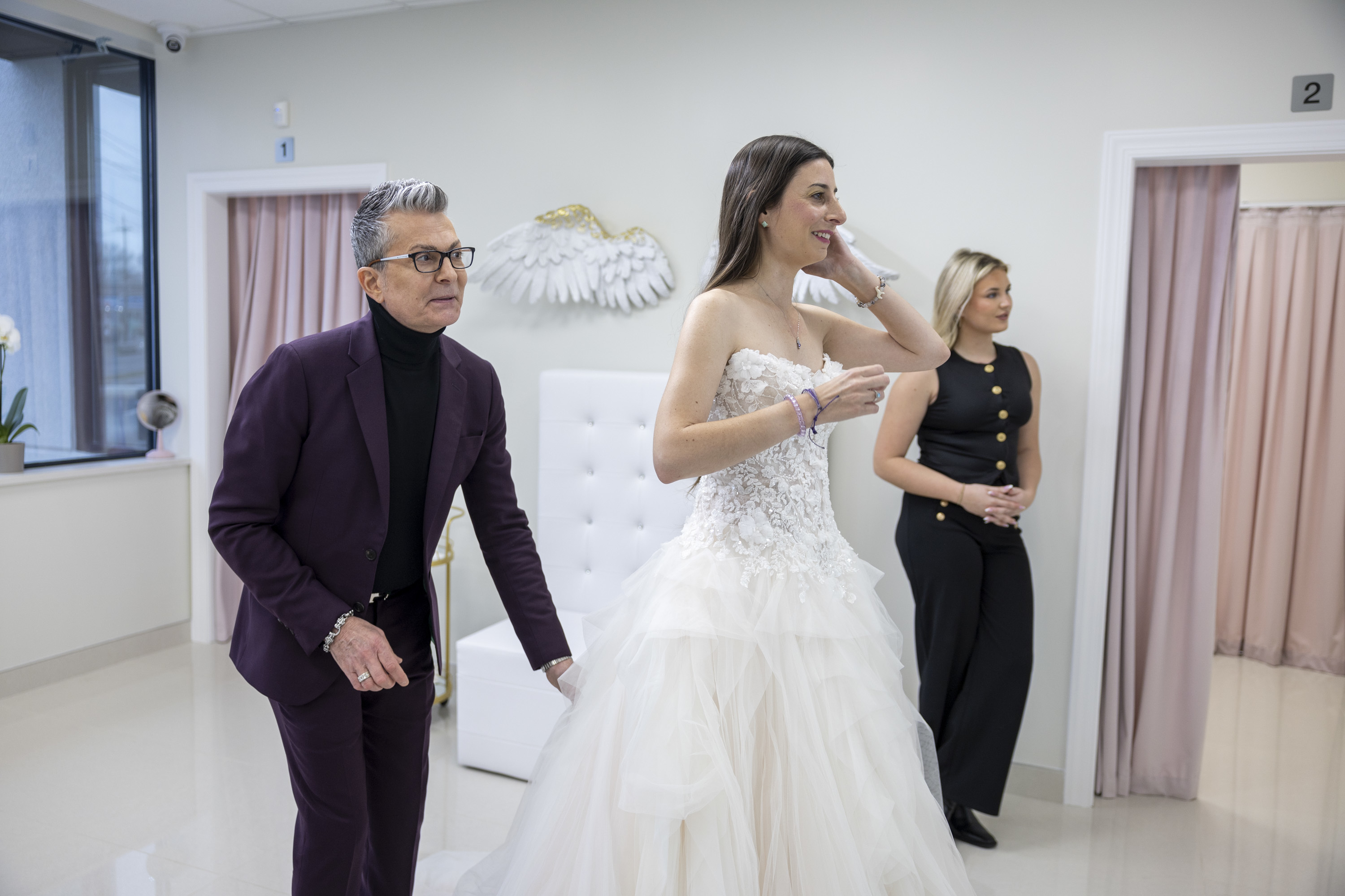 Before the marathon of brides arrived, Fenoli and Dress 2 Impress’ staff huddled in a back room, as the celebrity stylist imparted his time-tested wisdom onto the group. How do you match a bride to the right silhouette for her body type? How do you manage an overbearing family member with too many opinions?