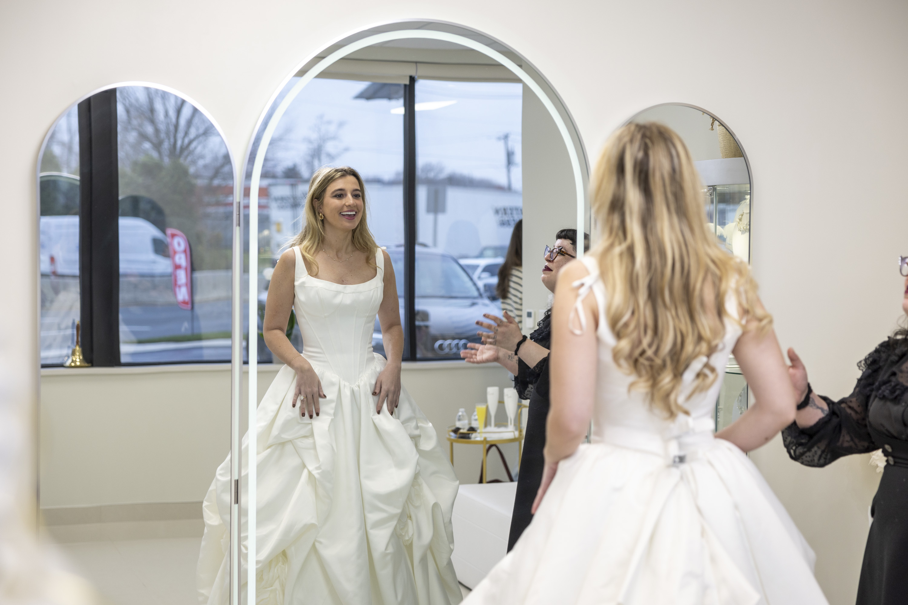 Over the next hour, Hafner emerged from the dressing room in dress after dress, first in a strapless gown with a structured corset top, then another with sequins, one with lace, and another with elegant detachable sleeves.