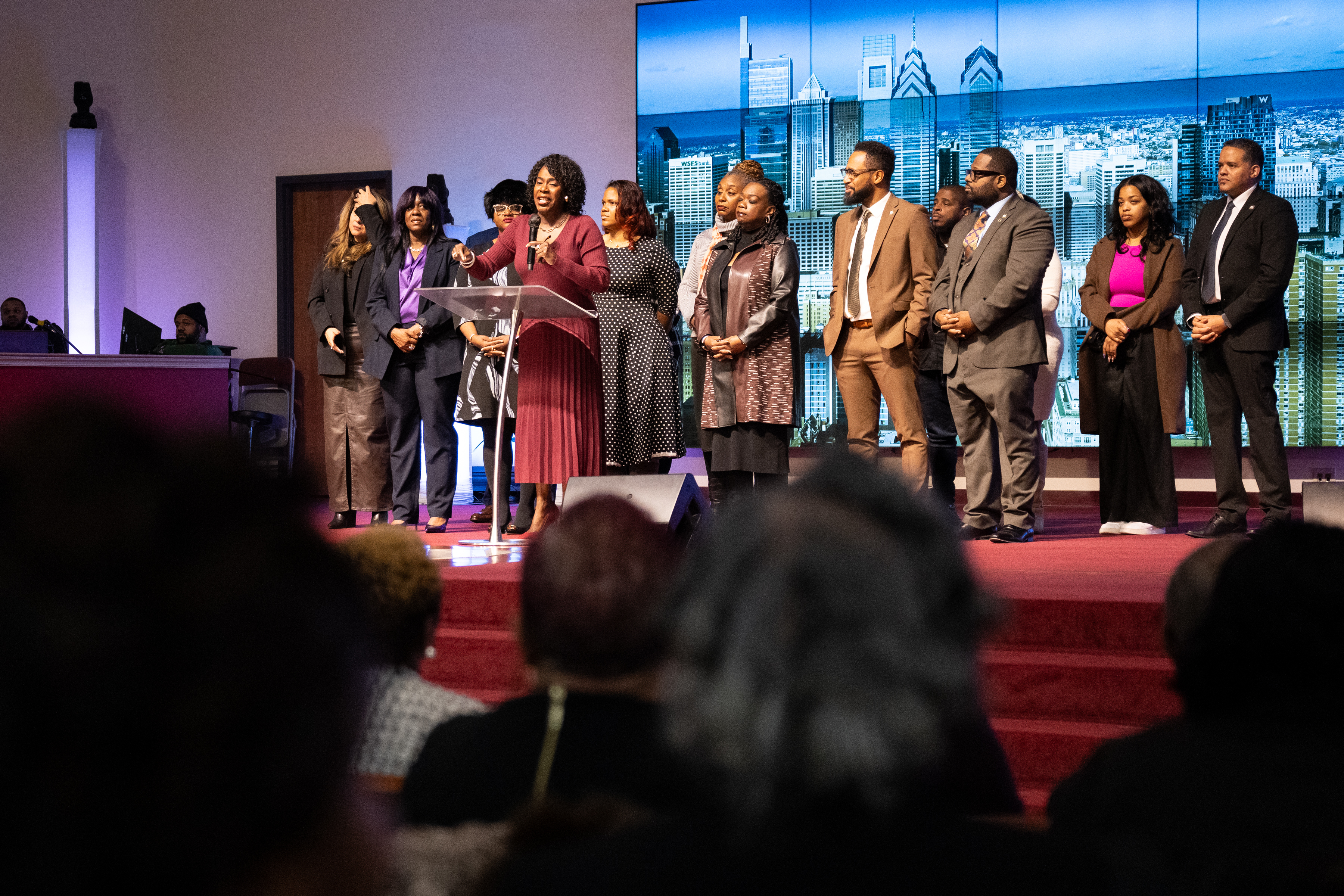Mayor Cherelle L. Parker speaks to the crowd at The Church of Christian Compassion in the Cobbs Creek neighborhood of West Philadelphia on Sunday, Dec. 7, 2025. Parker visited 10 churches in Philadelphia on Sunday to share details about her H.O.M.E. housing plan.