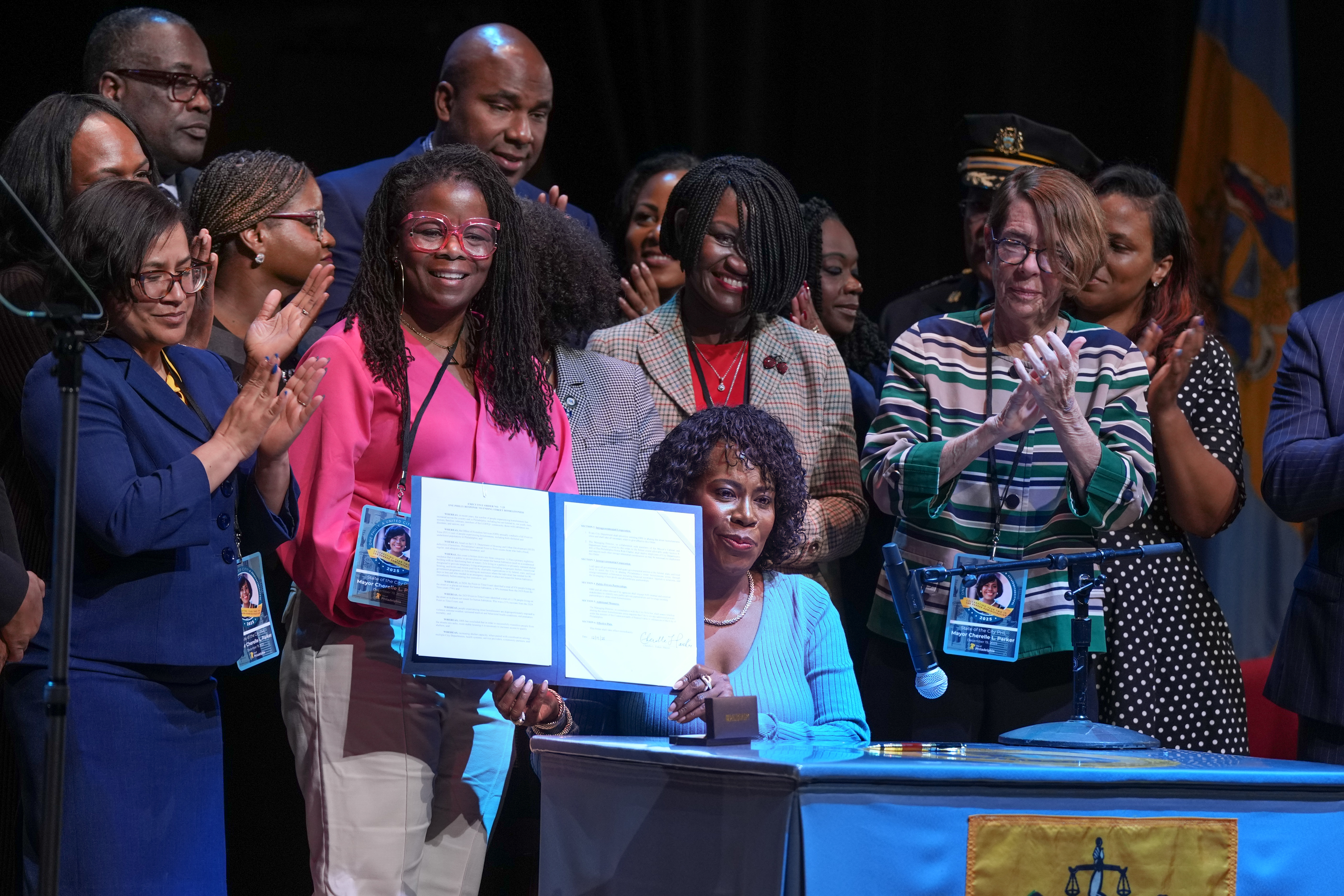 Philadelphia Mayor Cherelle L. Parker holds up executive order ending street homelessness.