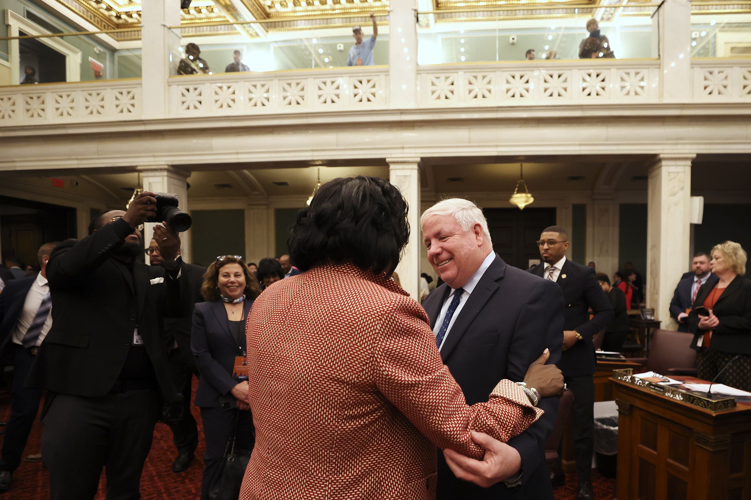 Councilmember Mike Driscoll, who represents the 6th District and authored the legislation, greets Mayor Cherelle Parker after her first budget address in City Council in March 2024.